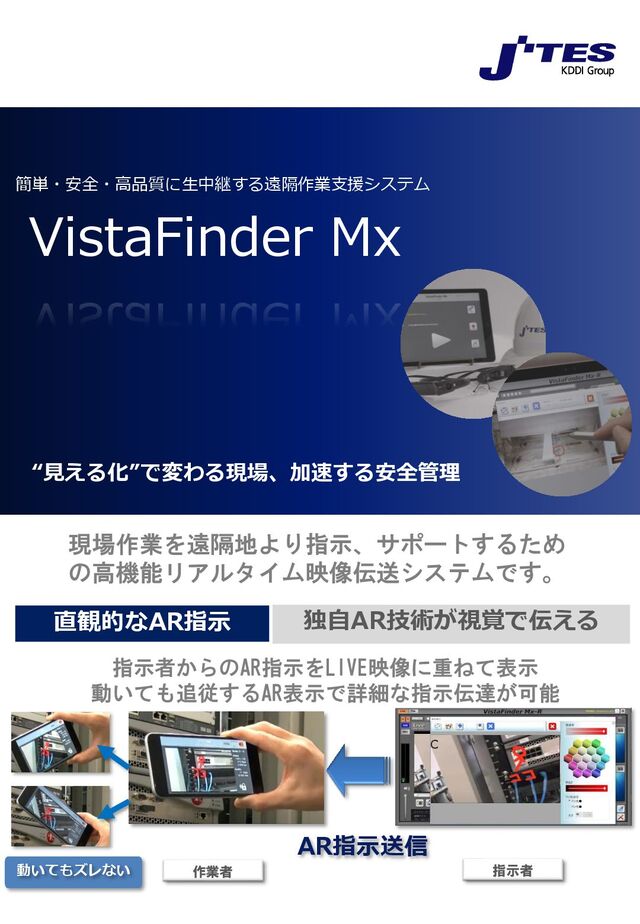 解像度 より鮮明な視認性 視認性が向上し小さなタグや細かなキズも認識しやすい 素材の質感や空間を鮮明に確認できる 対応解像度 4K FULLHD HD VGA ~ QQVGA 直観的なAR指示 独自AR技術が視覚で伝える 指示者からのAR指示をLIVE映像に重ねて表示 動いても追従するAR表示で詳細な指示伝達が可能 AR指示送信 c 作業者 指示者 動いてもズレない 作業者 指示者 動いてもズレない 多彩な 解像度 より鮮明な視認性 視認性が向上し小さなタグや細かなキズも認識しやすい 素材の質感や空間を鮮明に確認できる 視認性向上 動いても追従するAR表示 国際基準方式「KCipher-2」を搭載 従来のAES※方式の 約10倍の高速処理・高機密性 ※AES:アメリカ連邦政府標準の暗号方式 AR指示送信 ワンクリック接続 アプリ起動で自動接続 作業者画面(送信) 手動接続も自動接続も可能 選択 自動接続開始 簡単接続 ※AES:アメリカ連邦政府標準の暗号方式 拠点一元管理 最大12拠点同時接続 セキュリティ 安心・軽快な最新の暗号方式 指示者画面(受信) チャンネル 各拠点状況表示 拡大表示 チャンネルを選択し 各拠点に個別の指示が可能 利用シーン ハンズフリー・AR を活用した設備保守 外部接続カメラや AR指示機能を使った 設備保守支援 緊急時の現場報告 緊急時の現場状況を 本部へ生中継で報告 災害時BCP対策 災害地からの 状況報告