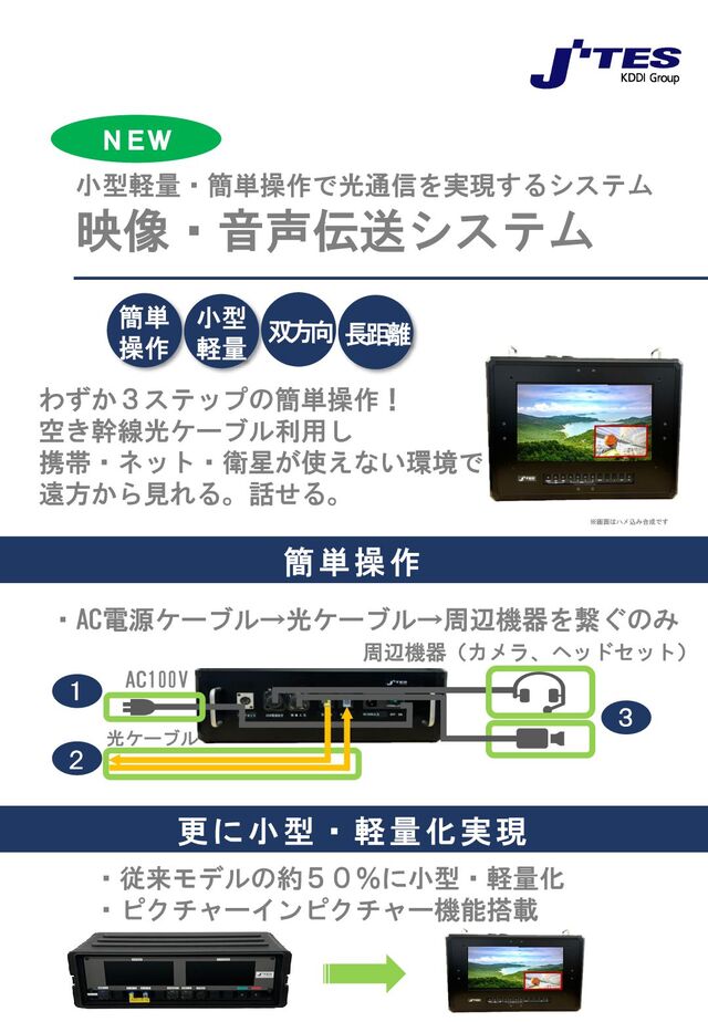 が 使 え な い 災 害 地 等 の 映 像 ・ 音 声 を ド ロ ー ン に て 撮 影 。 災 害 対 策 室 へ リ ア ル タ イ ム 双 方 向 伝 送 ! い ち 早 く 災 害 状 況 を 伝 達 出 来 ま す 。 幹 線 光 ケ ー ブ ル 等 空 き 芯 線 使 用 ド ロ ー ン 映 像 + 音 声 双 方 向 伝 送 災 害 対 策 室 災 害 現 場 スマートフォン・タブレット型 ドローンプロポ 携 帯 電 波 が 使 え な い ト ン ネ ル 等 の 作 業 現 場 の 映 像 ・ 音 声 を リ ア ル タ イ ム 双 方 向 伝 送 ! 現 場 の 作 業 指 示 ・ 管 理 が 行 え ま す 。 現 場 事 務 所 作 業 現 場 スマートフォンカメラ 又は HDMIカメラ等 工 事 中 ト ン ネ ル と う 道 局 舎 内 等 映 像 + 音 声 双 方 向 伝 送 幹 線 光 ケ ー ブ ル 等 空 き 芯 線 使 用 活 用 例 ① 災 害 対 応 活 用 例 ② 現 場 管 理 製品仕様 •映像・音声入出力部 映像入力:HDMI(1080P)タイプA 音声入出力:アナログ(4ピン 専用ヘッドセット) •光ファイバ入出力部 SCコネクタ 1.55μm、送受信 計2芯使用 入出力部 シングルモードファイバ 使用光ファイバー 約50km ※ファイバ特性によります。 最大伝送距離 手振れ補正機能付きHDMIカメラ(USB給電) カメラ 専用ドングルにてスマートフォン又はタブレット端末と Wi-Fi接続し画面ミラーリング 画面ミラーリング入力 AC100V 電源 幅40cm × 高さ30cm × 奥行15cm ※突起部除く 寸法 約7.5kg 重量 ※活用例ページ内のドローン、スマートフォン、タブレットは別売りとなります。 ※映像入力はHDMI1系統で、カメラまたはミラーリング入力となります。 ※表紙、活用例の機器イメージ図、写真は実際のデザインとは異なります。 ※当機は映像、音声のみを伝送するシステムであり、インターネット接続はできません。 ※「Wi-Fi」は、Wi-Fi Allianceの登録商標です。 ※HDMI、HDMIロゴ、およびHigh-Definition Multimedia InterfaceはHDMI Licensing,LLC の商標または登録商標です。 日本通信エンジニアリングサービス株式会社 h t t p : / / w w w . j - t e s . c o . j p / TEL: 03-3347-8101 お問い合わせ ・光通信により約50kmの双方向伝送が可能