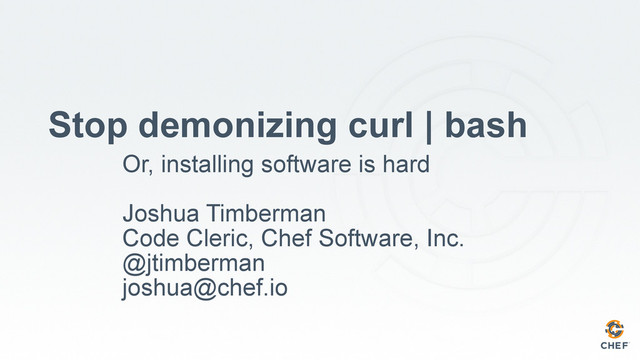 • Running arbitrary code as root is bad • Running arbitrary code as root from an unencrypted source is bad • Running arbitrary code as root from an unencrypted source may yield different results in six months than it does today (and that's bad)! • Also, shell scripts aren't inherently convergent or idempotent, so the author has to implement that too