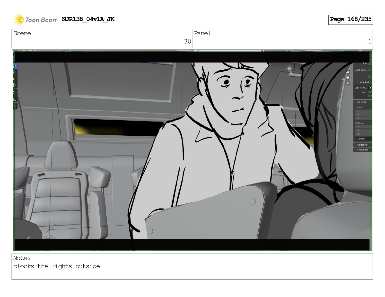 Scene 30 Panel 2 Notes clocks the lights outside NJR138_04v1A_JK