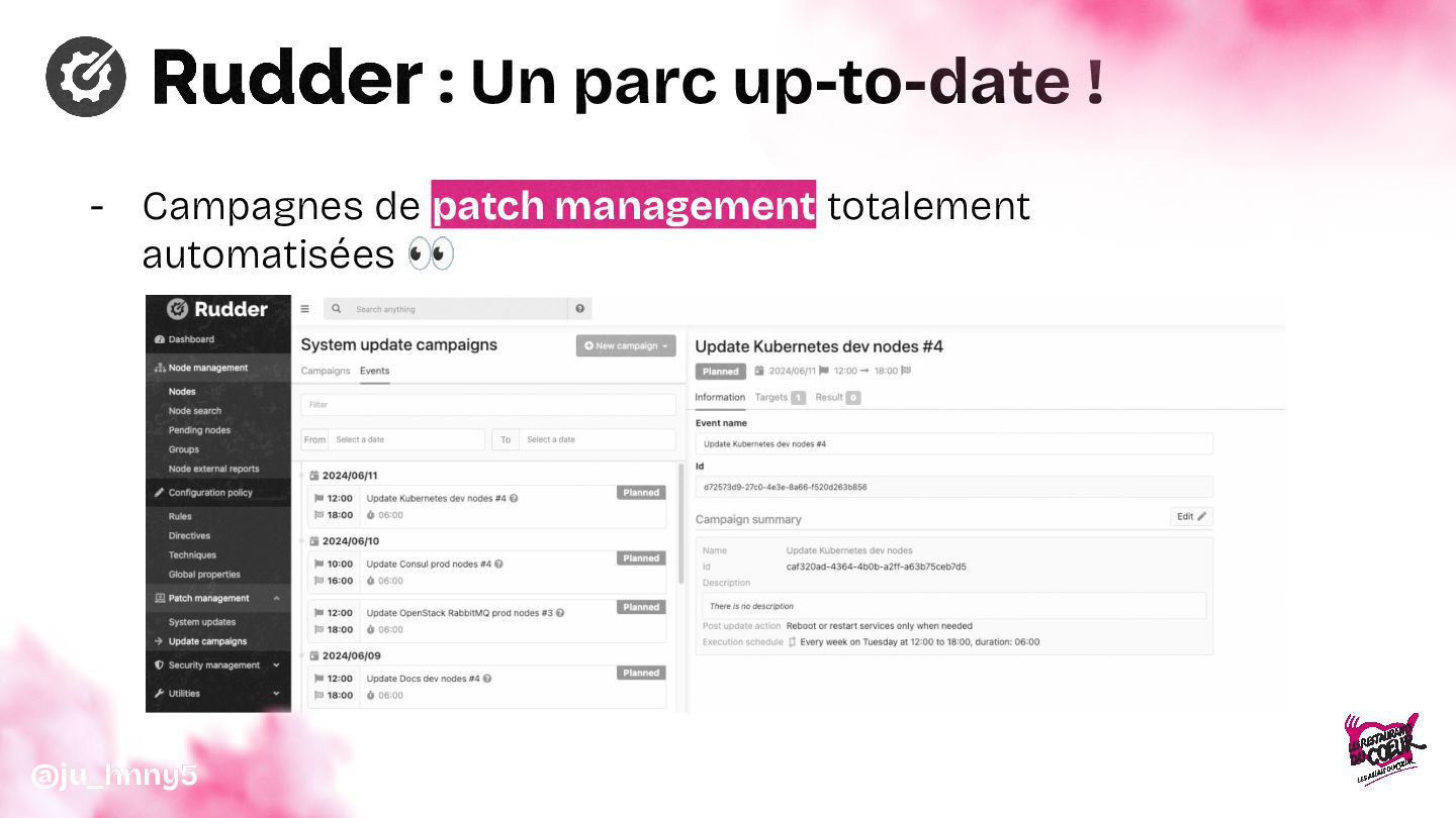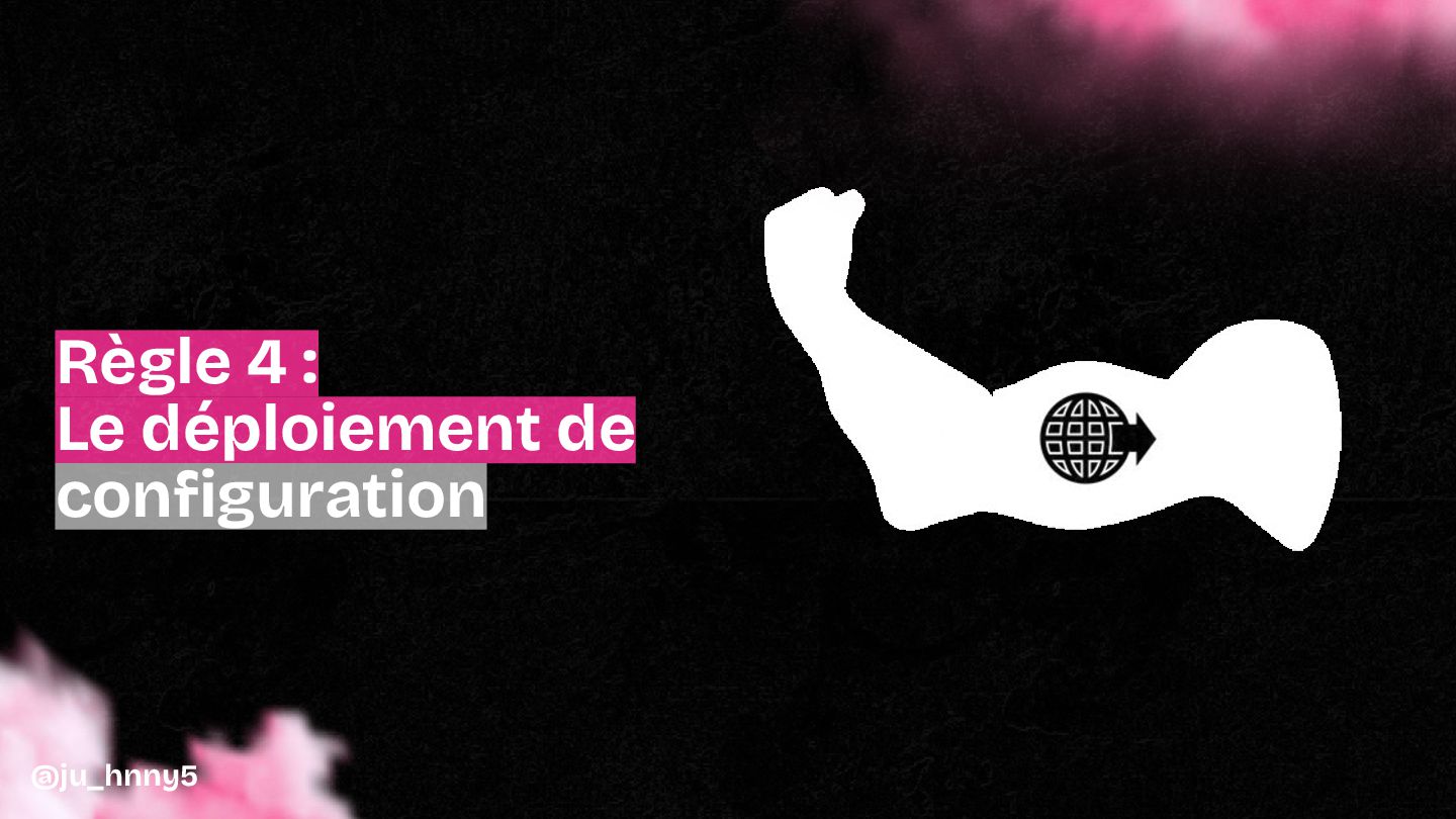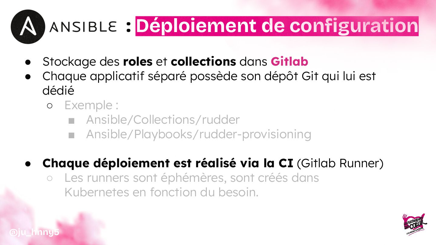 applicatif séparé possède son dépôt Git qui lui est dédié ◦ Exemple : ▪ Ansible/Collections/rudder ▪ Ansible/Playbooks/rudder-provisioning • Chaque déploiement est réalisé via la CI (Gitlab Runner) ◦ Les runners sont éphémères, sont créés dans Kubernetes en fonction du besoin. : Déploiement de configuration @ju_hnny5
