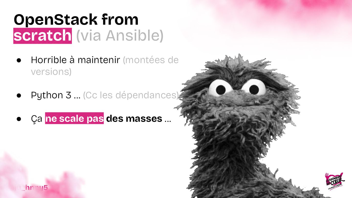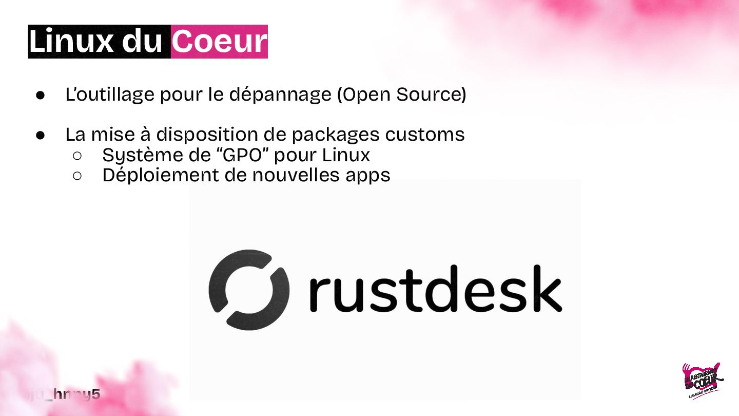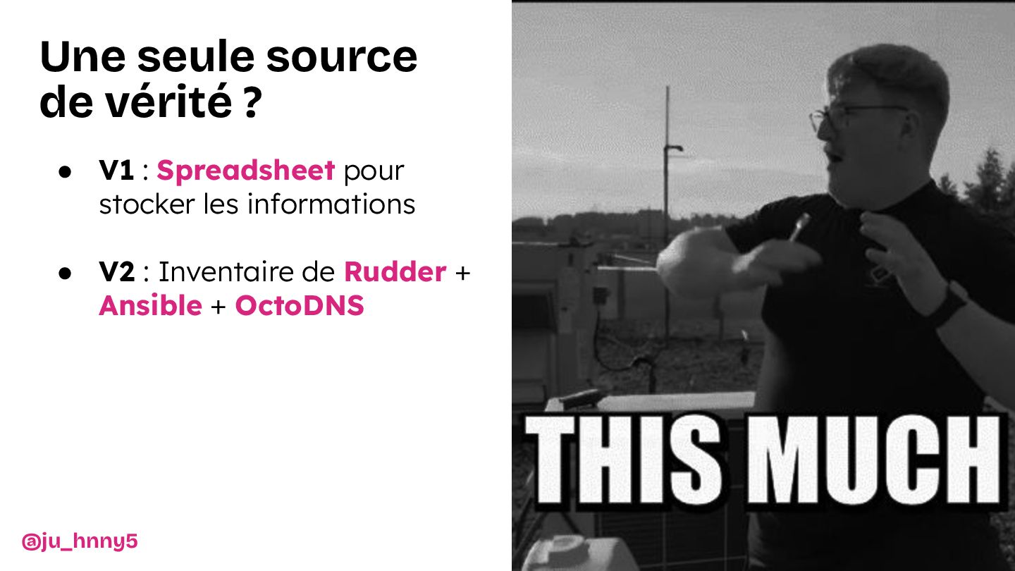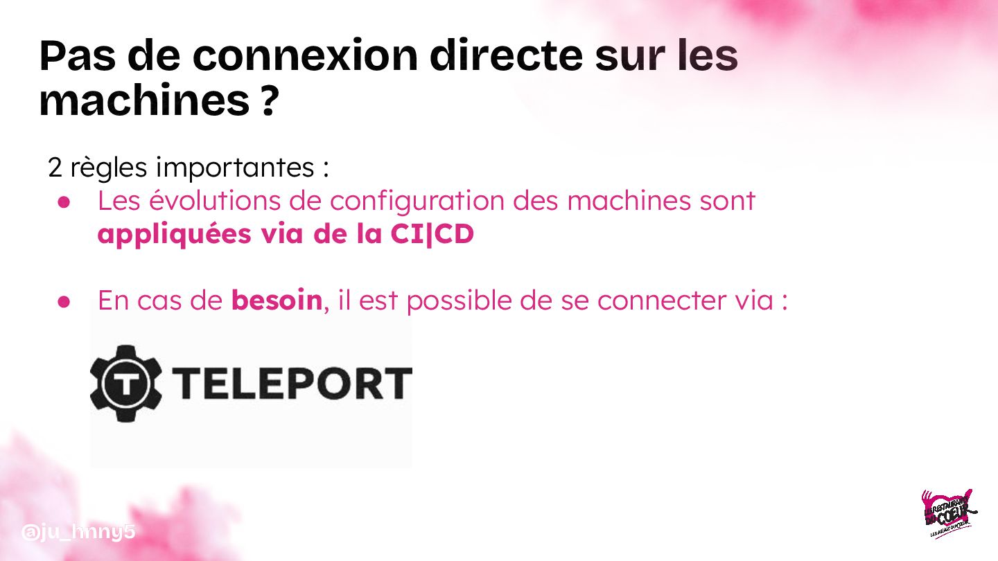 applicatif séparé possède son dépôt Git qui lui est dédié ◦ Exemple : ▪ Ansible/Collections/rudder ▪ Ansible/Playbooks/rudder-provisioning • Chaque déploiement est réalisé via la CI (Gitlab Runner) ◦ Les runners sont éphémères, sont créés dans Kubernetes en fonction du besoin. : Déploiement de configuration @ju_hnny5