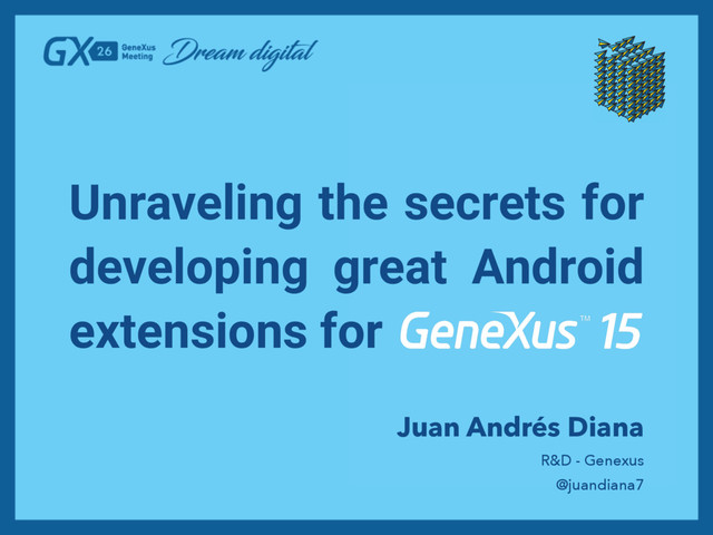 In this session you will learn how to develop Android extensions for Genexus 15 ™. Furthermore, you will get a brief overview of the current state of Android extension development for Genexus and a sneak peek of what's coming.