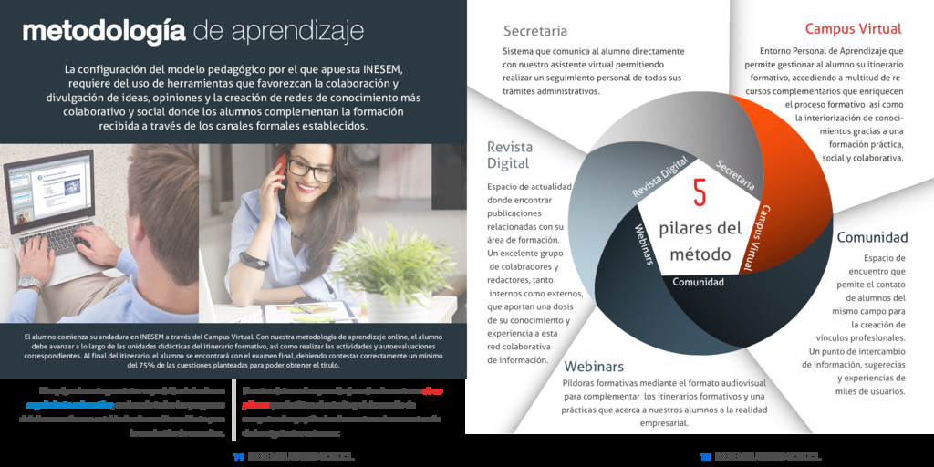 Master en Pedagogía Montessori [ 15 ] INESEM BUSINESS SCHOOL metodología de aprendizaje La configuración del modelo pedagógico por el que apuesta INESEM, requiere del uso de herramientas que favorezcan la colaboración y divulgación de ideas, opiniones y la creación de redes de conocimiento más colaborativo y social donde los alumnos complementan la formación recibida a través de los canales formales establecidos. El alumno comienza su andadura en INESEM a través del Campus Virtual. Con nuestra metodología de aprendizaje online, el alumno debe avanzar a lo largo de las unidades didácticas del itinerario formativo, así como realizar las actividades y autoevaluaciones correspondientes. Al final del itinerario, el alumno se encontrará con el examen final, debiendo contestar correctamente un mínimo del 75% de las cuestiones planteadas para poder obtener el título. El equipo docente y un tutor especializado harán un seguimiento exhaustivo, evaluando todos los progresos del alumno así como estableciendo una línea abierta para la resolución de consultas. Nuestro sistema de aprendizaje se fundamenta en cinco pilares que facilitan el estudio y el desarrollo de competencias y aptitudes de nuestros alumnos a través de los siguientes entornos:
