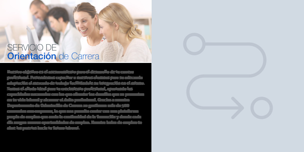 para el desarrollo de tu carrera profesional. Pretendemos capacitar a nuestros alumnos para su adecuada adaptación al mercado de trabajo facilitándole su integración en el mismo. Somos el aliado ideal para tu crecimiento profesional, aportando las capacidades necesarias con las que afrontar los desafíos que se presenten en tu vida laboral y alcanzar el éxito profesional. Gracias a nuestro Departamento de Orientación de Carrera se gestionan más de 500 convenios con empresas, lo que nos permite contar con una plataforma propia de empleo que avala la continuidad de la formación y donde cada día surgen nuevas oportunidades de empleo. Nuestra bolsa de empleo te abre las puertas hacia tu futuro laboral.