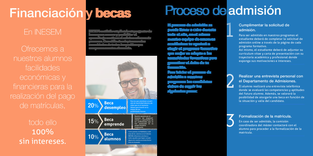 financieras para la realización del pago de matrículas, todo ello 100% sin intereses. y becas INESEM continúa ampliando su programa de becas para acercar y posibilitar el aprendizaje continuo al máximo número de personas. Con el fin de adaptarnos a las necesidades de todos los perfiles que componen nuestro alumnado. Proceso de El proceso de admisión se puede llevar a cabo durante todo el año, en el mismo nuestro equipo de asesores académicos te ayudará a elegir el programa formativo que mejor se adapte a las necesidades formativas para garantizar el éxito de tu formación. Para iniciar el proceso de admisión a nuestros programas los candidatos deben de seguir los siguientes pasos: admisión Cumplimentar la solicitud de admisión. Para ser admitido en nuestros programas el estudiante deberá de completar la solicitud de admisión online a través de la página de cada programa formativo. Así mismo, el estudiante deberá de adjuntar su currículum vitae y carta de presentación con su trayectoria académica y profesional donde exponga sus motivaciones e intereses. Realizar una entrevista personal con el Departamento de Admisiones. El alumno realizará una entrevista telefónica donde se evaluará las competencias y aptitudes del futuro alumno. Además, se valorará la posibilidad de otorgarle una beca en función de la situación y valía del candidato. Formalización de la matrícula. En caso de ser admitido, la comisión coordinadora del máster contactará con el alumno para proceder a la formalización de la matrícula.