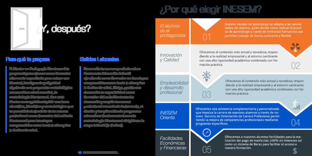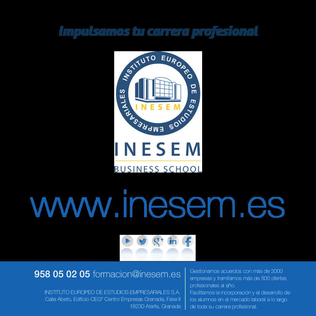 SOBRE INESEM BUSINESS SCHOOL INESEM Business School como Escuela de Negocios Online tiene por objetivo desde su nacimiento trabajar para fomentar y contribuir al desarrollo profesional y personal de sus alumnos. Promovemos una enseñanza multidisciplinar e integrada, mediante la aplicación de metodologías innovadoras de aprendizaje que faciliten la interiorización de conocimientos para una aplicación práctica orientada al cumplimiento de los objetivos de nuestros itinerarios formativos. En definitiva, en INESEM queremos ser el lugar donde te gustaría desarrollar y mejorar tu carrera profesional. Porque sabemos que la clave del éxito en el mercado es la "Formación Práctica" que permita superar los retos que deben de afrontar los profesionales del futuro.