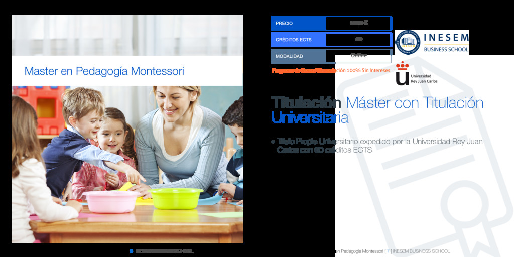 Master en Pedagogía Montessori [ 7 ] INESEM BUSINESS SCHOOL Master en Pedagogía Montessori PRECIO 1970 € CRÉDITOS ECTS 60 MODALIDAD Online Programa de Becas / Financiación 100% Sin Intereses Entidad impartidora: Titulación Máster con Titulación Universitaria Título Propio Universitario expedido por la Universidad Rey Juan q Carlos con 60 créditos ECTS