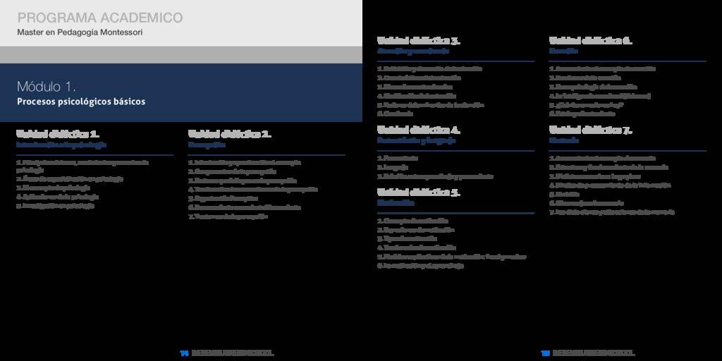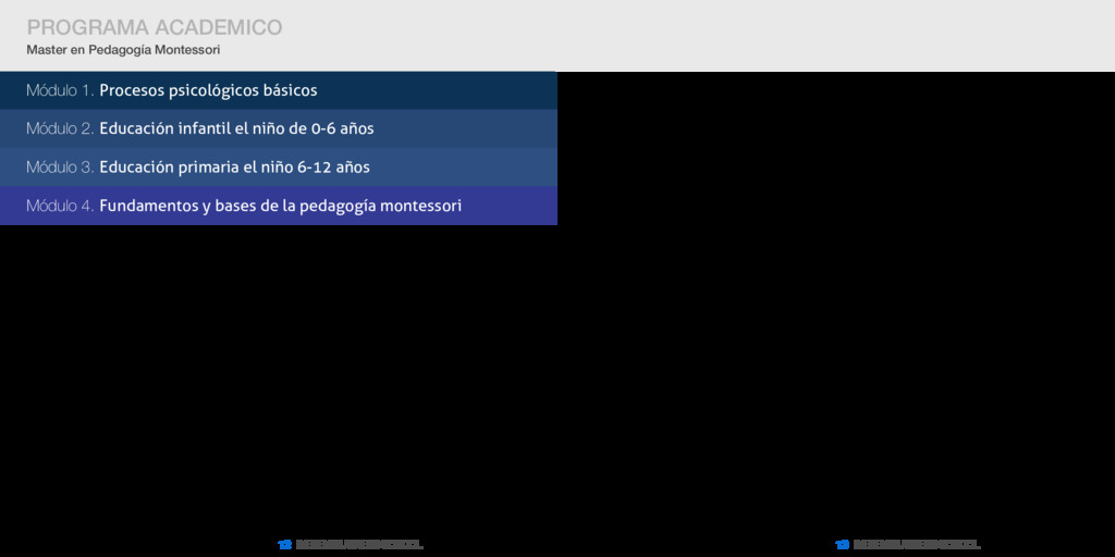 Master en Pedagogía Montessori [ 13 ] INESEM BUSINESS SCHOOL PROGRAMA ACADEMICO Master en Pedagogía Montessori Módulo 1. Procesos psicológicos básicos Módulo 2. Educación infantil el niño de 0-6 años Módulo 3. Educación primaria el niño 6-12 años Módulo 4. Fundamentos y bases de la pedagogía montessori