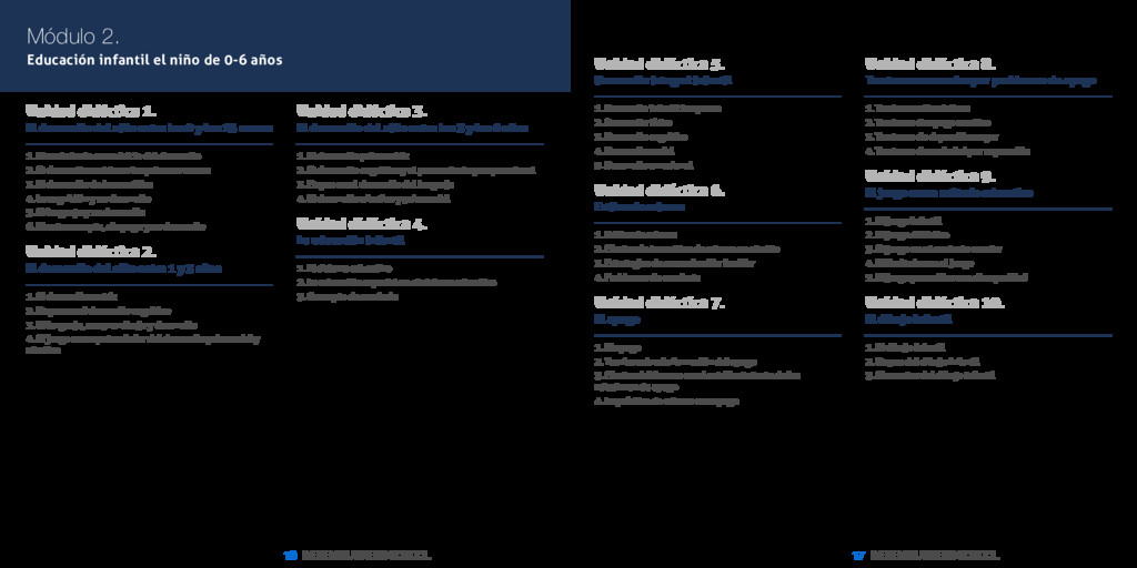 Master en Pedagogía Montessori [ 17 ] INESEM BUSINESS SCHOOL Módulo 2. Educación infantil el niño de 0-6 años Unidad didáctica 1. El desarrollo del niño entre los 0 y los 15 meses 1. El nacimiento como inicio del desarrollo 2. El desarrollo motriz en los primeros meses 3. El desarrollo de los sentidos 4. La cognición y su desarrollo 5. El lenguaje y su desarrollo 6. El autoconcepto, el apego y su desarrollo Unidad didáctica 2. El desarrollo del niño entre 1 y 3 años 1. El desarrollo motriz 2. Etapas en el desarrollo cognitivo 3. El lenguaje, su aprendizaje y desarrollo 4. El juego como potenciador del desarrollo psicosocial y afectivo Unidad didáctica 3. El desarrollo del niño entre los 3 y los 6 años 1. El desarrollo psicomotriz 2. El desarrollo cognitivo y el pensamiento preoperacional 3. Etapas en el desarrollo del lenguaje 4. El desarrollo afectivo y psicosocial Unidad didáctica 4. La educación infantil 1. El sistema educativo 2. La educación especial en el sistema educativo 3. Concepto de currículo Unidad didáctica 5. Desarrollo integral infantil 1. Desarrollo infantil temprano 2. Desarrollo físico 3. Desarrollo cognitivo 4. Desarrollo social 5. Desarrollo emocional Unidad didáctica 6. Estilos de crianza 1. Estilos de crianza 2. Efectos de los estilos de crianza en el niño 3. Estrategias de comunicación familiar 4. Problemas de conducta Unidad didáctica 7. El apego 1. El apego 2. Teorías sobre la formación del apego 3. Efectos del fracaso en el establecimiento de las relaciones de apego 4. La práctica de crianza con apego Unidad didáctica 8. Trastornos causados por problemas de apego 1. Trastornos disociativos 2. Trastorno de apego reactivo 3. Trastorno de depresión mayor 4. Trastorno de ansiedad por separación Unidad didáctica 9. El juego como método educativo 1. El juego infantil 2. El juego didáctico 3. El juego en el contexto escolar 4. Dificultades en el juego 5. El juego para niños con discapacidad Unidad didáctica 10. El dibujo infantil 1. El dibujo infantil 2. Etapas del dibujo infantil 3. Elementos del dibujo infantil