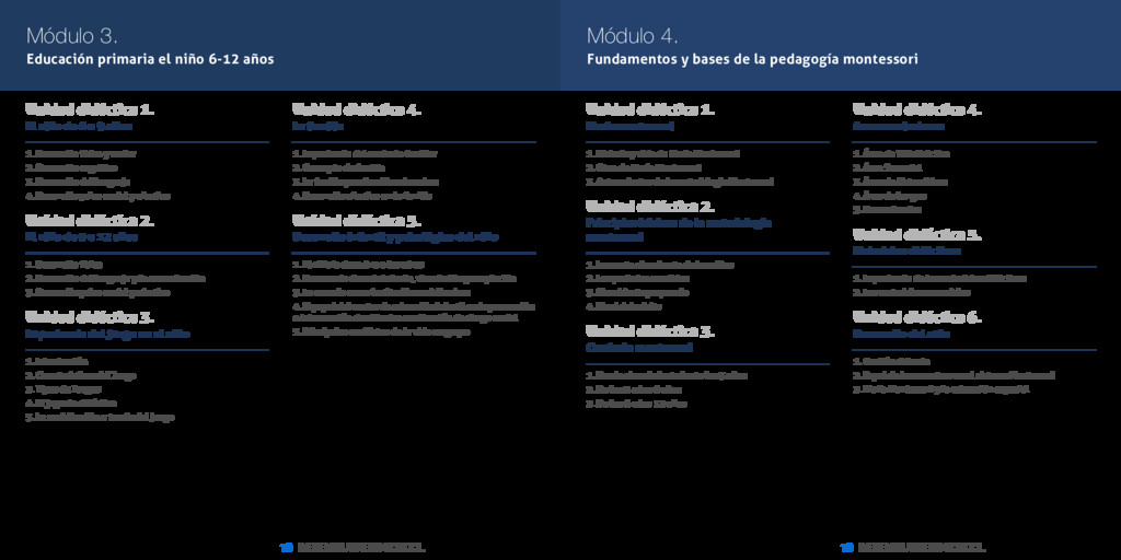 Master en Pedagogía Montessori [ 21 ] INESEM BUSINESS SCHOOL Unidad didáctica 7. Método montessori 1. Metodología de observación 2. Método de observación Montessori 3. Comparaciones entre el método Montessori y el método tradicional Unidad didáctica 8. Implantación en españa 1. Primeras escuelas Montessori 2. Situación actual de la Pedagogía Montessori en España 3. Número de escuelas Montessori en España