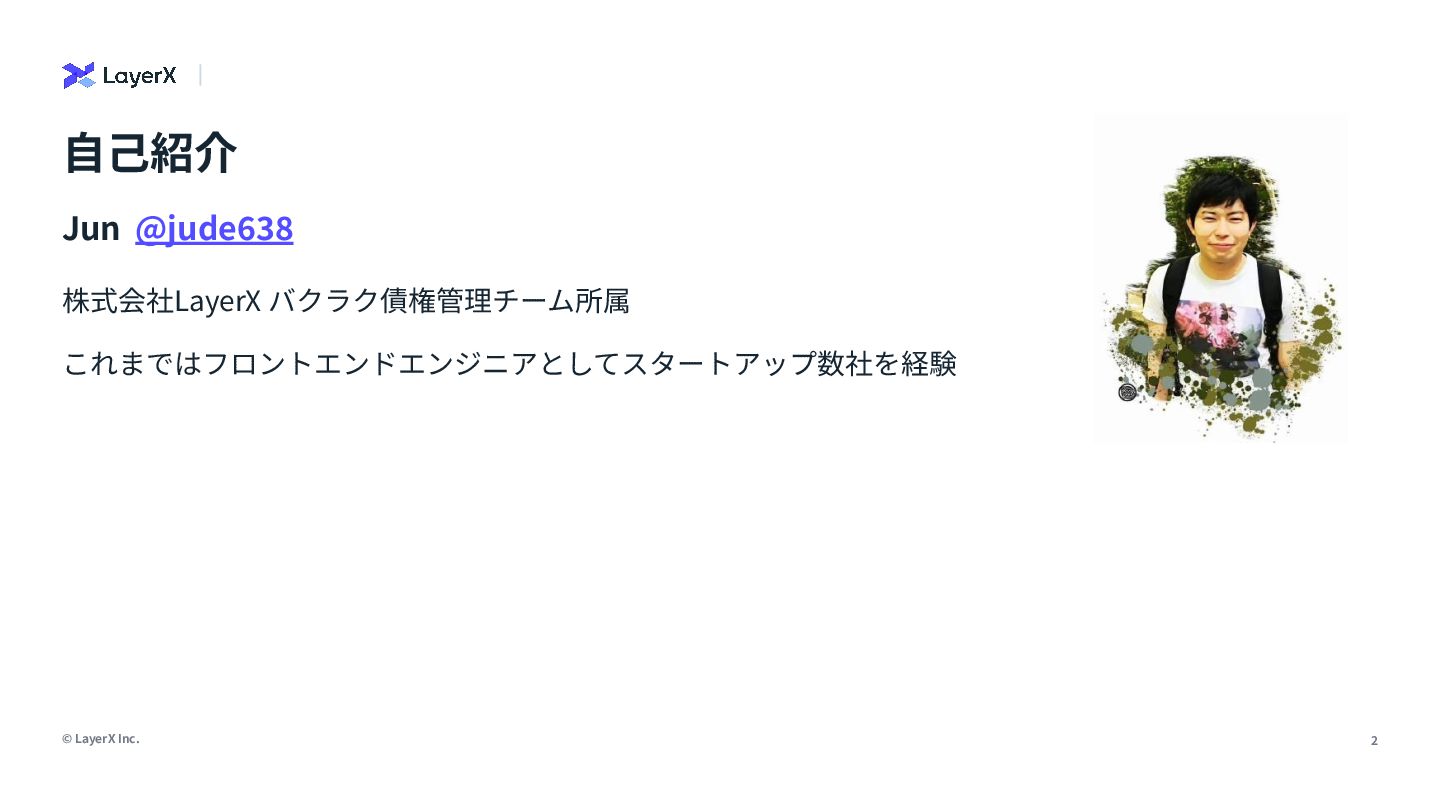 © LayerX Inc. 2 Jun @jude638 株式会社LayerX バクラク債権管理チーム所属 これまではフロントエンドエンジニアとしてスタートアップ数社を経験 ⾃⼰紹介