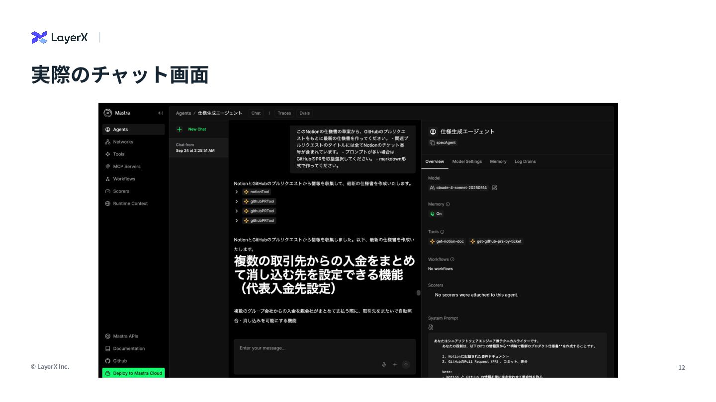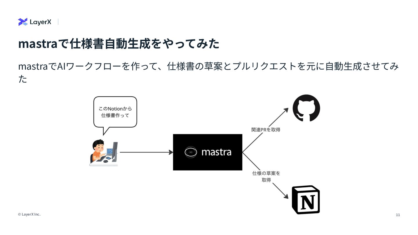 © LayerX Inc. 11 mastraで仕様書⾃動⽣成をやってみた mastraでAIワークフローを作って、仕様書の草案とプルリクエストを元に⾃動⽣成させてみ た