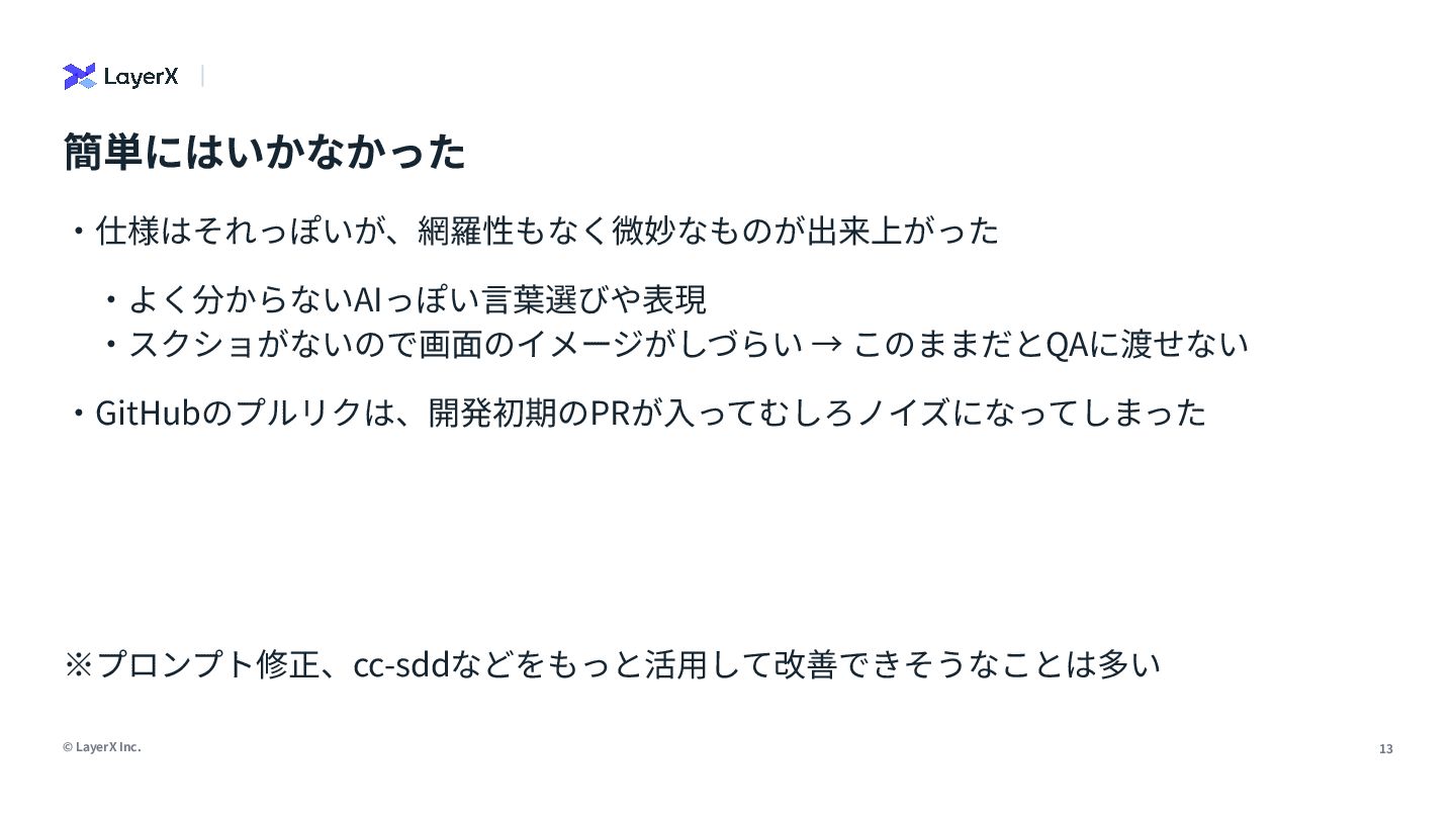 © LayerX Inc. 13 簡単にはいかなかった ‧仕様はそれっぽいが、網羅性もなく微妙なものが出来上がった ‧よく分からないAIっぽい⾔葉選びや表現 ‧スクショがないので画⾯のイメージがしづらい → このままだとQAに渡せない