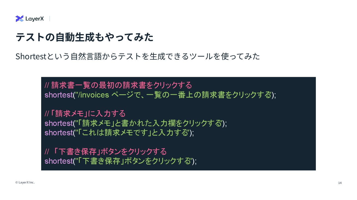 © LayerX Inc. 14 テストの⾃動⽣成もやってみた Shortestという⾃然⾔語からテストを⽣成できるツールを使ってみた // 請求書一覧の最初の請求書をクリックする shortest("/invoices ページで、一覧の一番上の請求書をクリックする