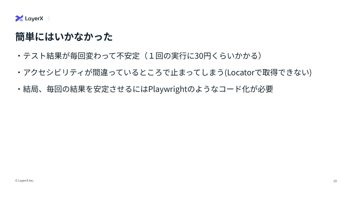 © LayerX Inc. 15 簡単にはいかなかった ‧テスト結果が毎回変わって不安定(1回の実⾏に30円くらいかかる) ‧アクセシビリティが間違っているところで⽌まってしまう(Locatorで取得できない) ‧結局、毎回の結果を安定させるにはPlaywrightのようなコード化が必要