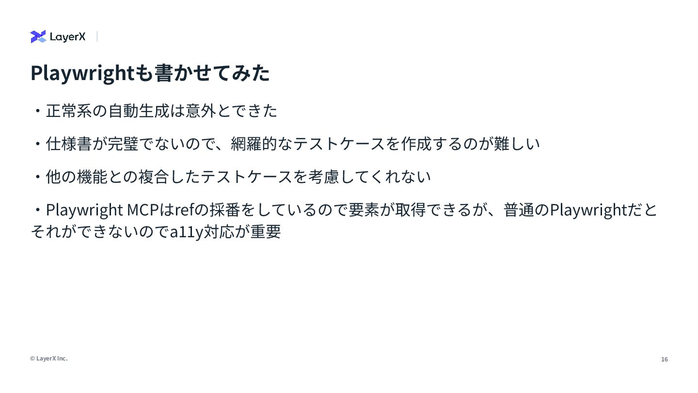 © LayerX Inc. 16 Playwrightも書かせてみた ‧正常系の⾃動⽣成は意外とできた ‧仕様書が完璧でないので、網羅的なテストケースを作成するのが難しい ‧他の機能との複合したテストケースを考慮してくれない ‧Playwright MCPはrefの採番をしているので要素が取得できるが、普通のPlaywrightだと