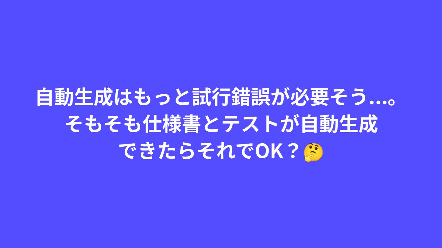 ⾃動⽣成はもっと試⾏錯誤が必要そう...。 そもそも仕様書とテストが⾃動⽣成 できたらそれでOK?🤔