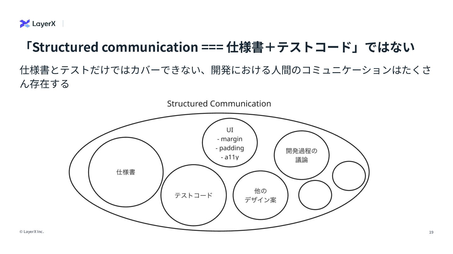 © LayerX Inc. 19 「Structured communication === 仕様書+テストコード」ではない 仕様書とテストだけではカバーできない、開発における⼈間のコミュニケーションはたくさ ん存在する