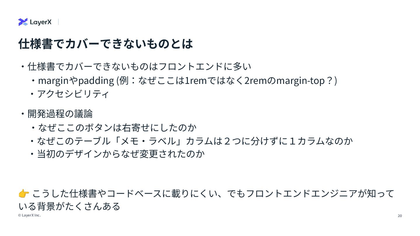 © LayerX Inc. 20 仕様書でカバーできないものとは ‧仕様書でカバーできないものはフロントエンドに多い ‧marginやpadding (例:なぜここは1remではなく2remのmargin-top?) ‧アクセシビリティ ‧開発過程の議論