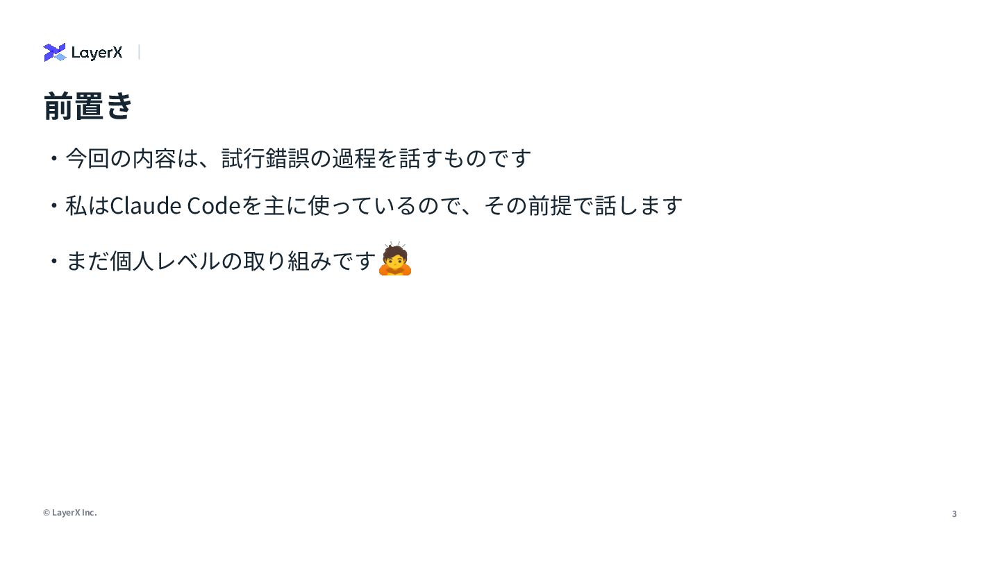 © LayerX Inc. 3 ‧今回の内容は、試⾏錯誤の過程を話すものです ‧私はClaude Codeを主に使っているので、その前提で話します ‧まだ個⼈レベルの取り組みです 🙇 前置き