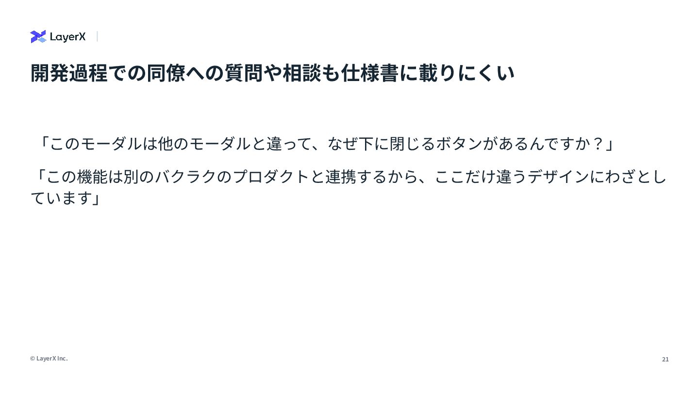 © LayerX Inc. 21 開発過程での同僚への質問や相談も仕様書に載りにくい 「このモーダルは他のモーダルと違って、なぜ下に閉じるボタンがあるんですか?」 「この機能は別のバクラクのプロダクトと連携するから、ここだけ違うデザインにわざとし ています」