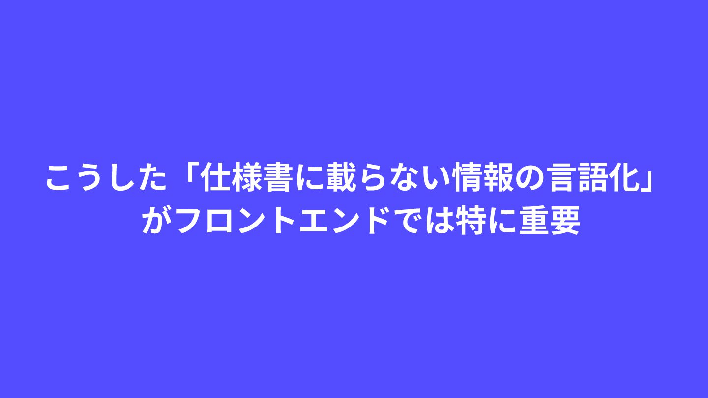 こうした「仕様書に載らない情報の⾔語化」 がフロントエンドでは特に重要