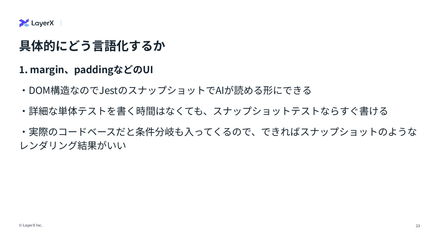 © LayerX Inc. 23 具体的にどう⾔語化するか 1. margin、paddingなどのUI ‧DOM構造なのでJestのスナップショットでAIが読める形にできる ‧詳細な単体テストを書く時間はなくても、スナップショットテストならすぐ書ける ‧実際のコードベースだと条件分岐も⼊ってくるので、できればスナップショットのような