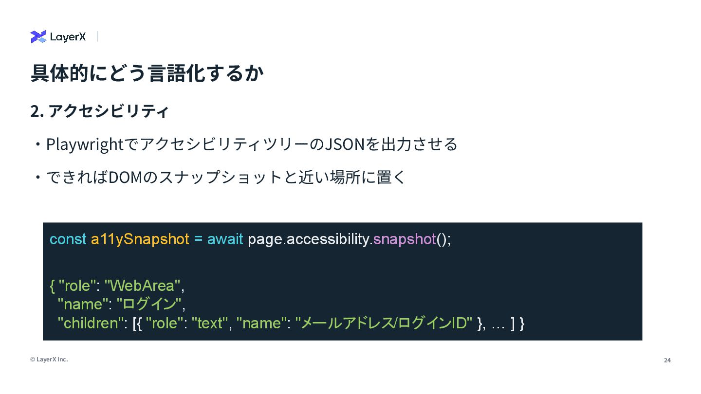 © LayerX Inc. 24 具体的にどう⾔語化するか 2. アクセシビリティ ‧PlaywrightでアクセシビリティツリーのJSONを出⼒させる ‧できればDOMのスナップショットと近い場所に置く