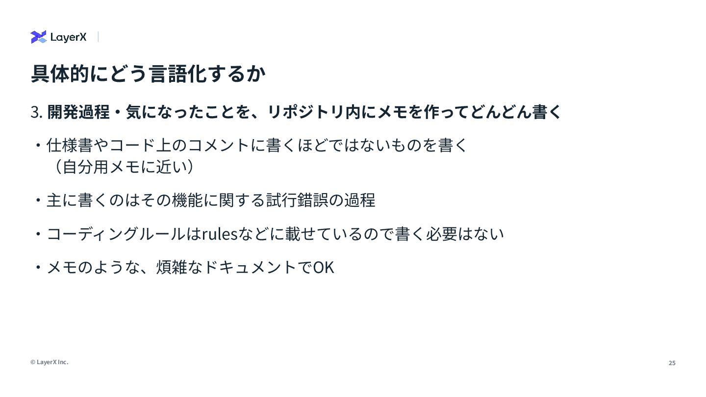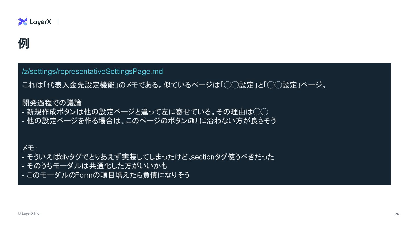 © LayerX Inc. 25 具体的にどう⾔語化するか 3. 開発過程‧気になったことを、リポジトリ内にメモを作ってどんどん書く ‧仕様書やコード上のコメントに書くほどではないものを書く (⾃分⽤メモに近い) ‧主に書くのはその機能に関する試⾏錯誤の過程