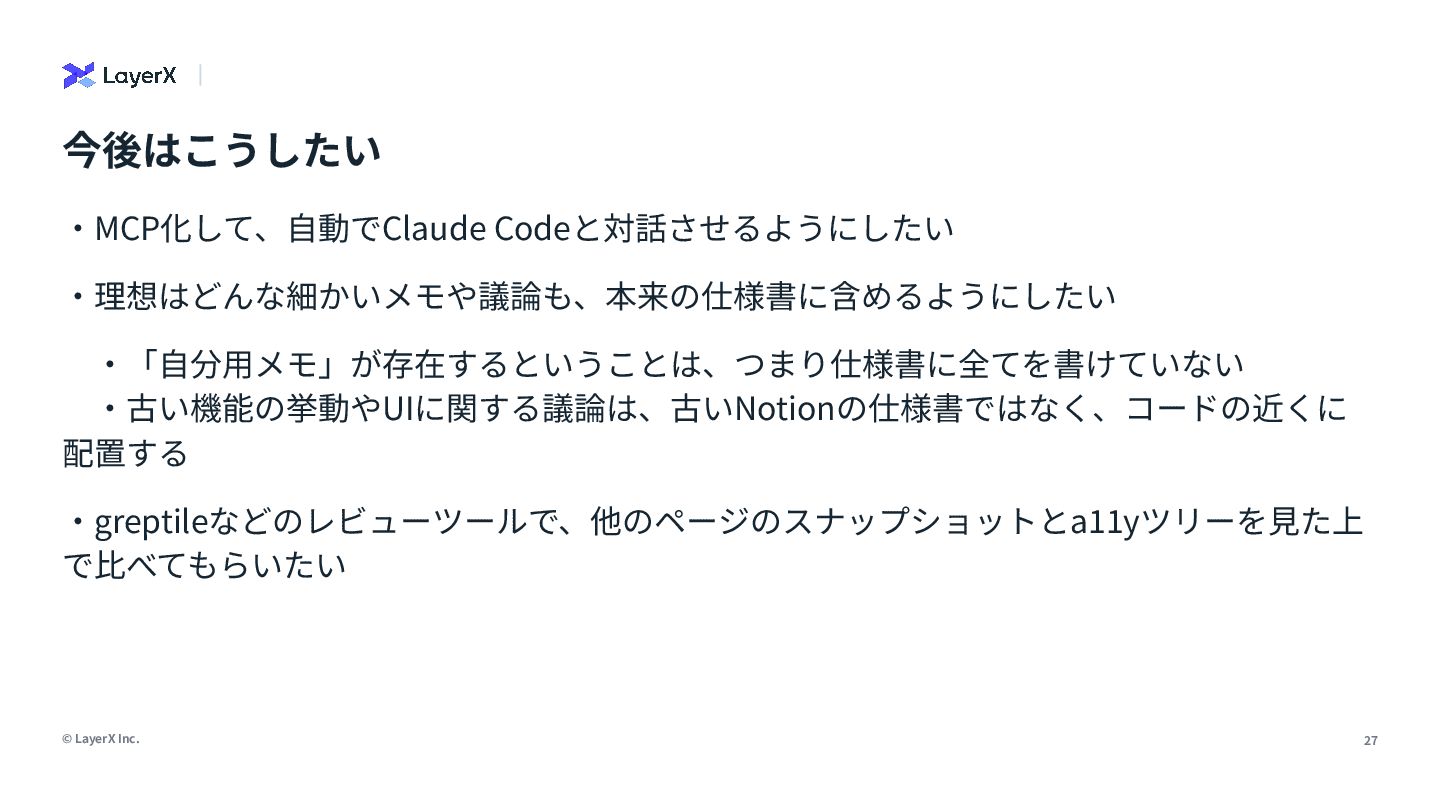 © LayerX Inc. 27 今後はこうしたい ‧MCP化して、⾃動でClaude Codeと対話させるようにしたい ‧理想はどんな細かいメモや議論も、本来の仕様書に含めるようにしたい ‧「⾃分⽤メモ」が存在するということは、つまり仕様書に全てを書けていない ‧古い機能の挙動やUIに関する議論は、古いNotionの仕様書ではなく、コードの近くに