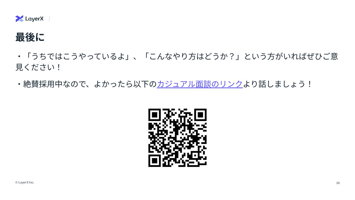 © LayerX Inc. 28 最後に ‧「うちではこうやっているよ」、「こんなやり⽅はどうか?」という⽅がいればぜひご意 ⾒ください! ‧絶賛採⽤中なので、よかったら以下のカジュアル⾯談のリンクより話しましょう!