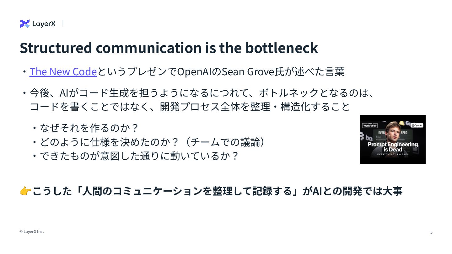 New CodeというプレゼンでOpenAIのSean Grove⽒が述べた⾔葉 ‧今後、AIがコード⽣成を担うようになるにつれて、ボトルネックとなるのは、 コードを書くことではなく、開発プロセス全体を整理‧構造化すること ‧なぜそれを作るのか? ‧どのように仕様を決めたのか?(チームでの議論) ‧できたものが意図した通りに動いているか? 👉こうした「⼈間のコミュニケーションを整理して記録する」がAIとの開発では⼤事