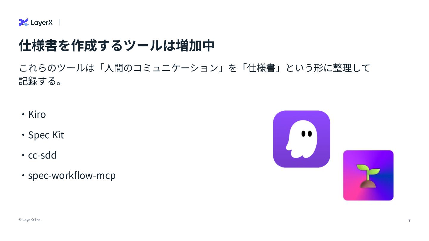 © LayerX Inc. 7 仕様書を作成するツールは増加中 これらのツールは「⼈間のコミュニケーション」を「仕様書」という形に整理して 記録する。 ‧Kiro ‧Spec Kit