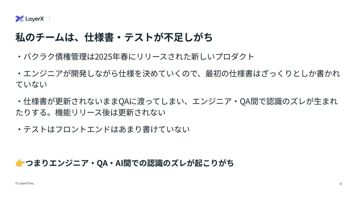 © LayerX Inc. 8 私のチームは、仕様書‧テストが不⾜しがち ‧バクラク債権管理は2025年春にリリースされた新しいプロダクト ‧エンジニアが開発しながら仕様を決めていくので、最初の仕様書はざっくりとしか書かれ ていない ‧仕様書が更新されないままQAに渡ってしまい、エンジニア‧QA間で認識のズレが⽣まれ たりする。機能リリース後は更新されない