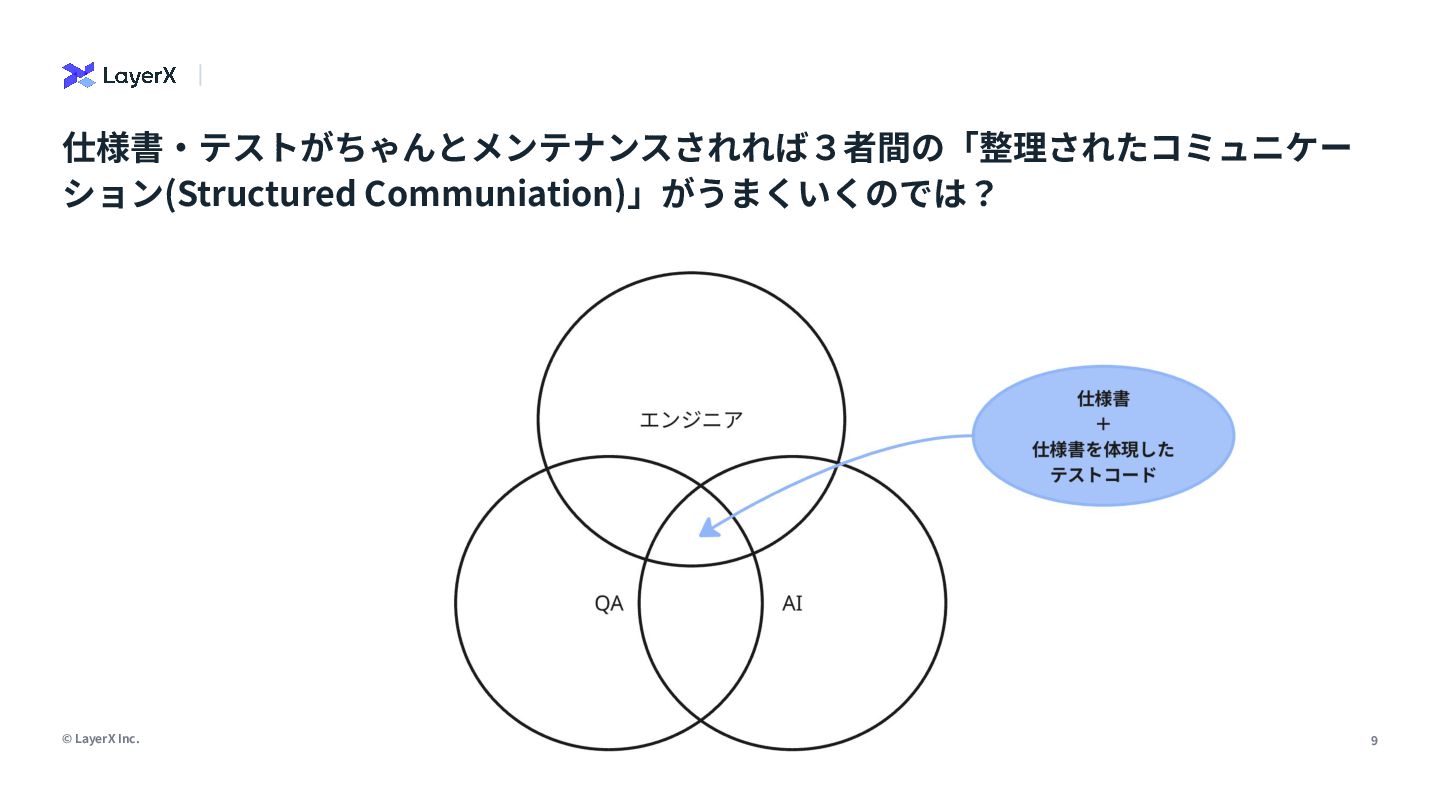 © LayerX Inc. 9 仕様書‧テストがちゃんとメンテナンスされれば3者間の「整理されたコミュニケー ション(Structured Communiation)」がうまくいくのでは?