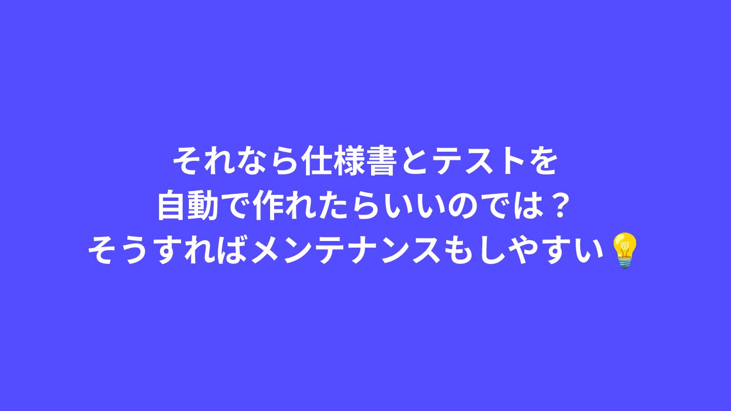 それなら仕様書とテストを ⾃動で作れたらいいのでは? そうすればメンテナンスもしやすい💡