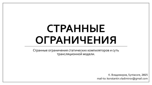 Рассмотрим, чем статически компилируемые языки отличаются от динамически компилируемых, что такое трансляционная семантика, чем трансляция отличается от исполнения и какие странные ограничения статических компиляторов это порождает.