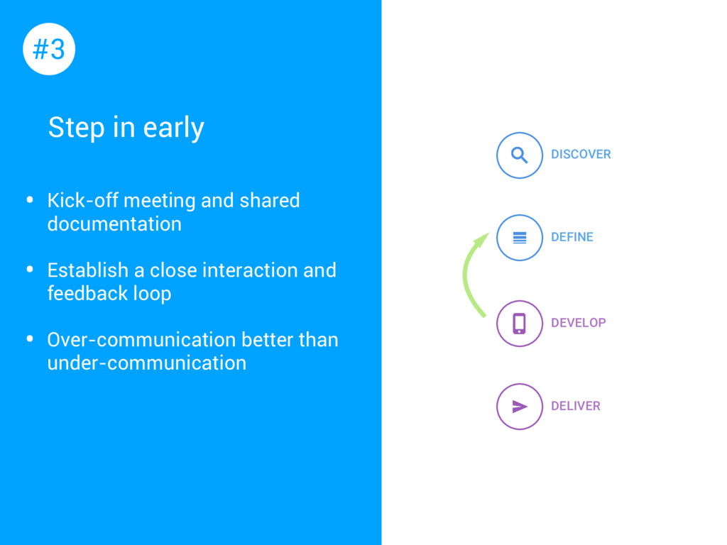 Establish a close interaction and feedback loop • Over-communication better than under-communication #3 DISCOVER DEFINE DEVELOP DELIVER