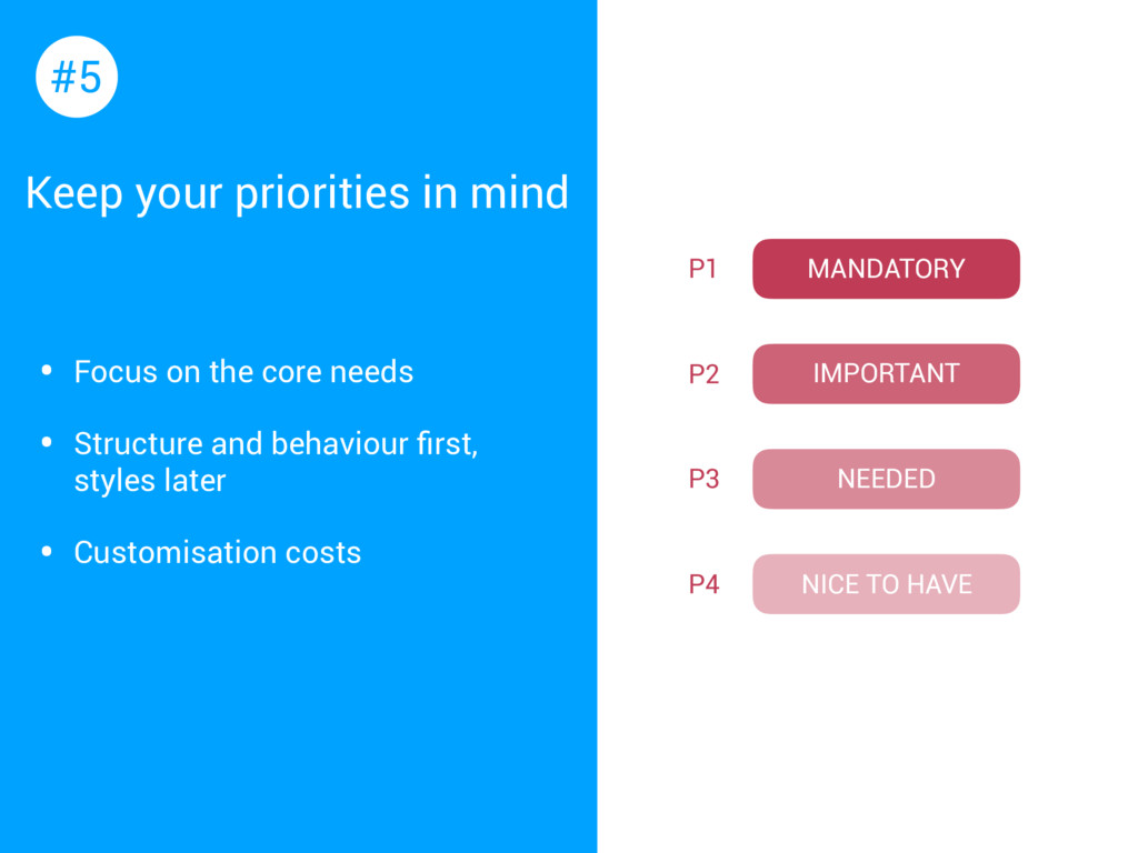 needs • Structure and behaviour first, styles later • Customisation costs #5 MANDATORY IMPORTANT NEEDED NICE TO HAVE P1 P2 P3 P4