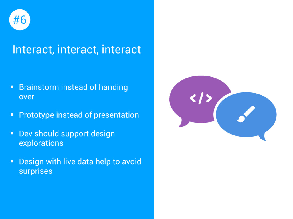 Prototype instead of presentation • Dev should support design explorations • Design with live data help to avoid surprises #6