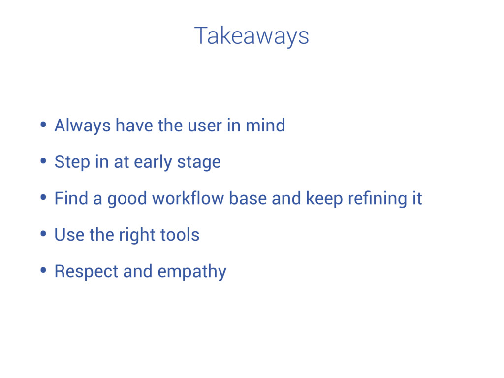 at early stage • Find a good workflow base and keep refining it • Use the right tools • Respect and empathy Takeaways