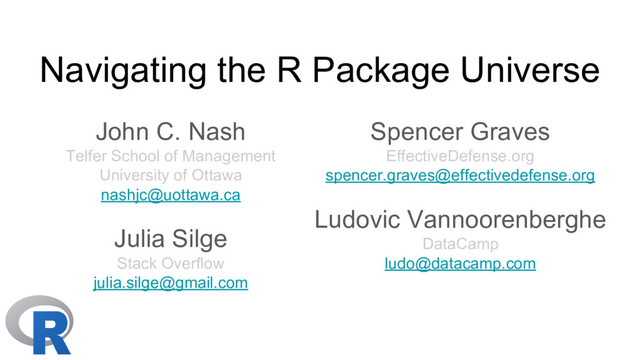 useR! Brussels BREAKOUT SESSIONS • Unification: John Nash in Plenary • Search: Spencer Graves in 3.02 • Guidance: Julia Silge in 2.02 https://github.com/nashjc/Rnavpkg