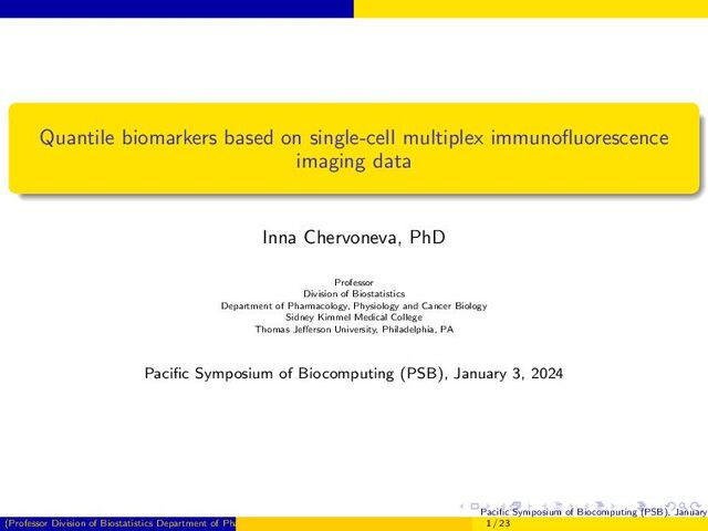 Qindex implements FR-QI and nlFR-QI Qindex is available in the CRAN depository https://CRAN.R-project.org/package=Qindex. Function FRindex in the package Qindex can be used to estimate β in the training data set and compute FR-QI for each subject in the training and a new test data set, if available. Function nlFRindex in the package Qindex can be used to estimate F(, ) in the training data set and compute nlFR-QI for each subject in the training and a new test data set, if available. FR-QI methodology and implementation in Qindex is described in [Yi et al, 2023a] Additional functions in package Qindex facilitate computations of sample quantiles in each cluster of observations (function clusterQp) identify optimal dichotomized continuous predictors using repeated split sampling (function optimSplit dichotom) compute bootstrap-based optimism correction for testing optimally dichotomized predictors in multivariable models (function BBC dichotom) R package Qindex also implements Optimal Quantile biomarkers described in [Yi et al, 2023b] Yi, M., Zhan, T., Peck, A. R., Hooke, J. A., Kovatich, A. J., Shriver, C. D., ..., Chervoneva, I. (2023a). Quantile Index Biomarkers Based on Single-Cell Expression Data. Laboratory Investigation, 103(8), 100158. Yi, M., Zhan, T., Peck, A. R., Hooke, J. A., Kovatich, A. J., Shriver, C. D., ... Chervoneva, I. (2023b). Selection of optimal quantile protein biomarkers based on cell-level immunohistochemistry data. BMC bioinformatics, 24(1), 298. (Professor Division of Biostatistics Department of Pharmacology, Physiology and Cancer Biology Sidney Kimmel Medical College Thomas Jefferson University, Phil Pacific Symposium of Biocomputing (PSB), January 11 / 23