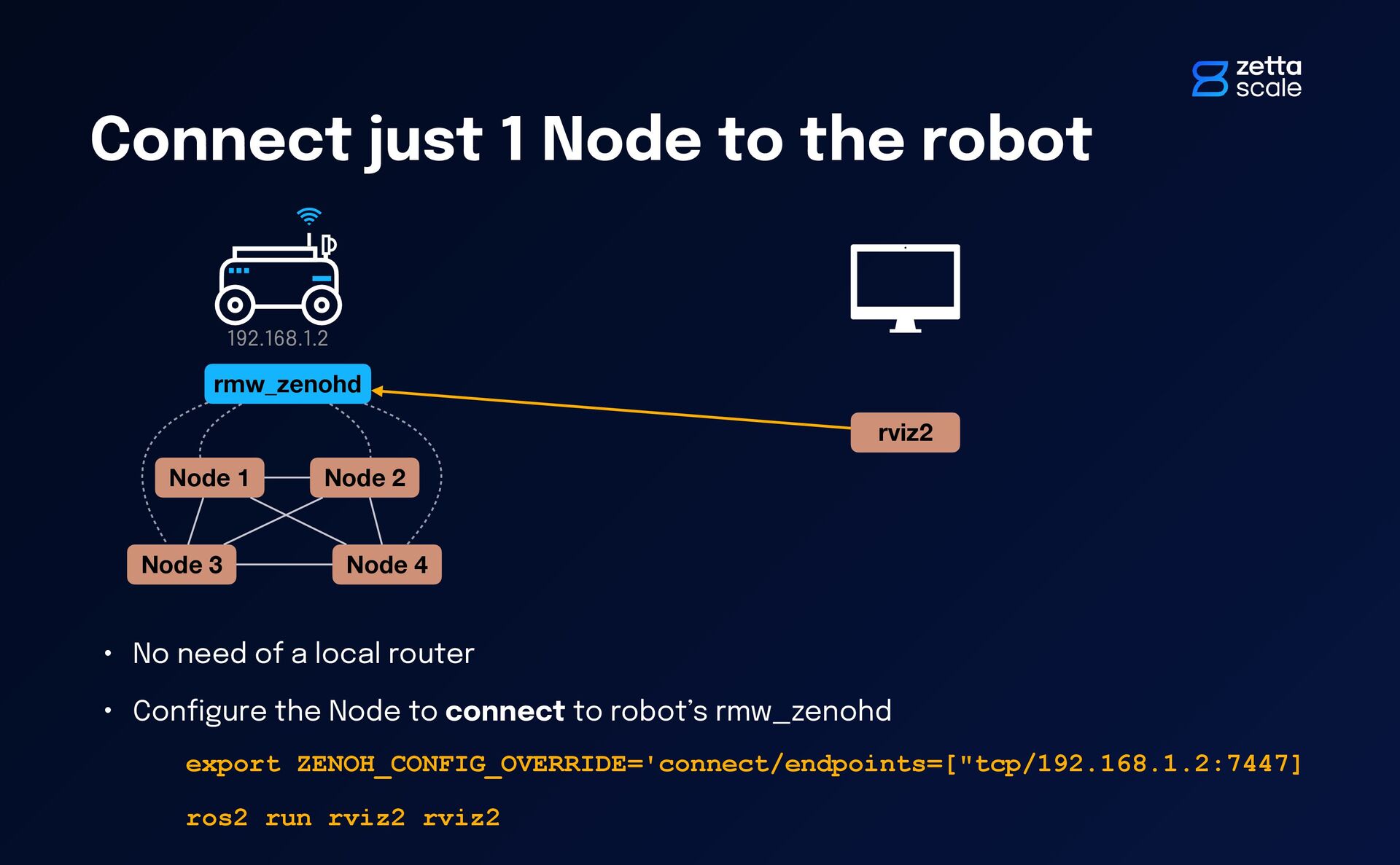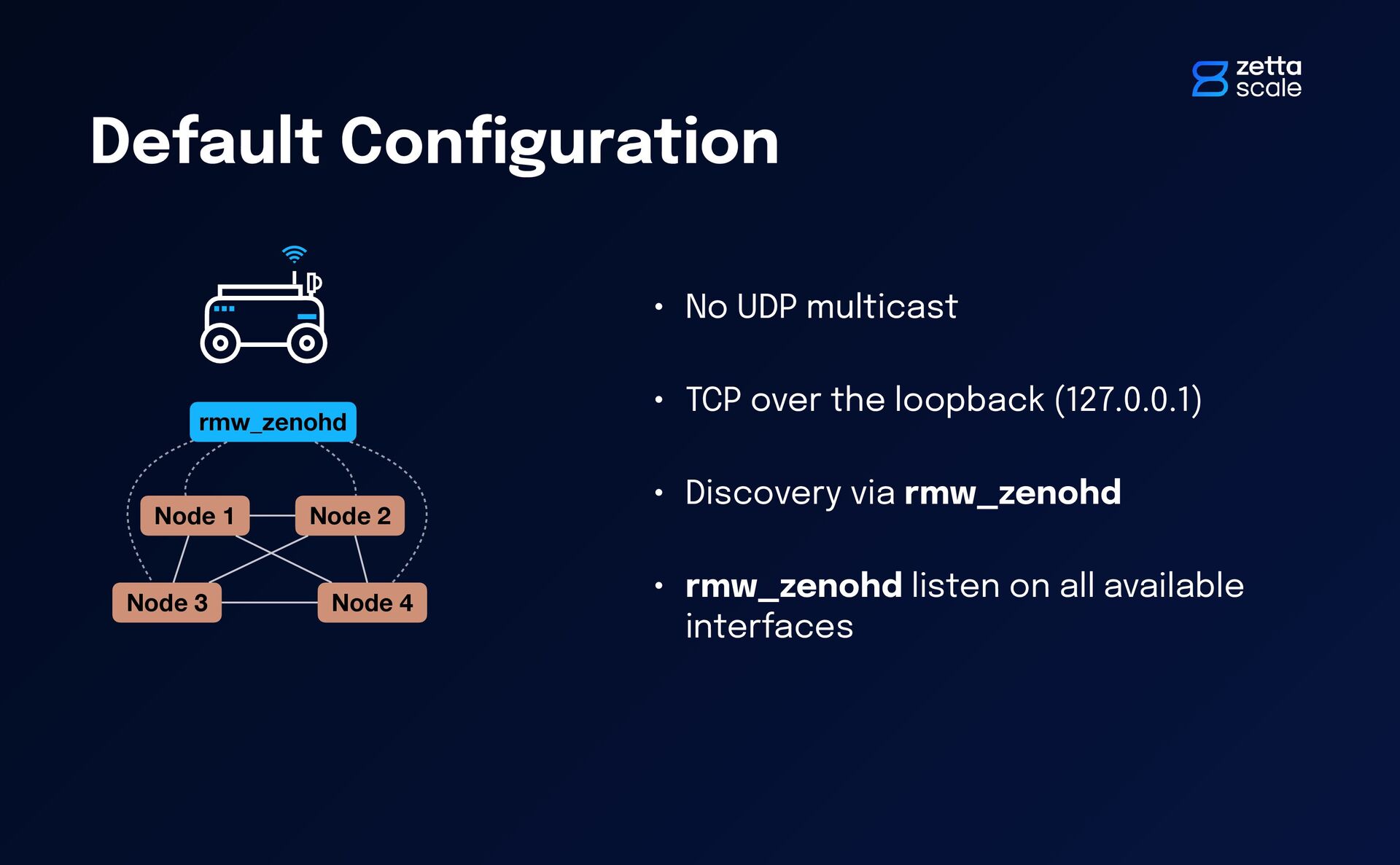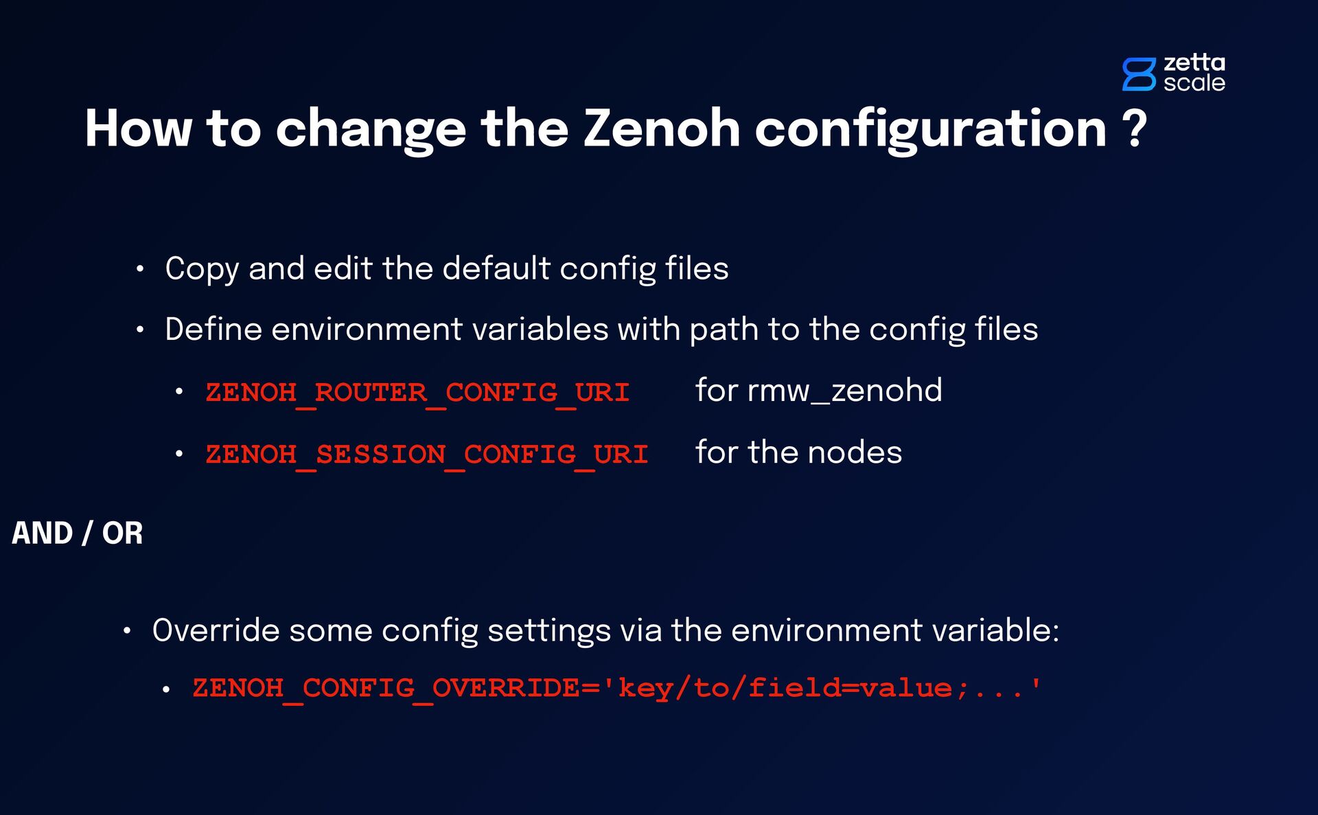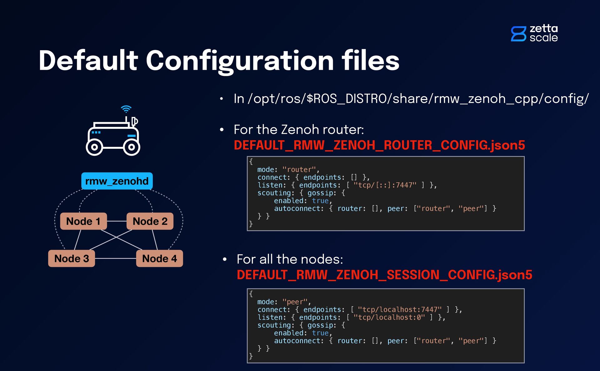 Node 3 Node 4 rmw_zenohd • In /opt/ros/$ROS_DISTRO/share/rmw_zenoh_cpp/con fi g/ • For the Zenoh router: DEFAULT_RMW_ZENOH_ROUTER_CONFIG.json5 • For all the nodes: DEFAULT_RMW_ZENOH_SESSION_CONFIG.json5 { mode: "router", connect: { endpoints: [] }, listen: { endpoints: [ "tcp/[::]:7447" ] }, scouting: { gossip: { enabled: true, autoconnect: { router: [], peer: ["router", "peer"] } } } } { mode: "peer", connect: { endpoints: [ "tcp/localhost:7447" ] }, listen: { endpoints: [ "tcp/localhost:0" ] }, scouting: { gossip: { enabled: true, autoconnect: { router: [], peer: ["router", "peer"] } } } }