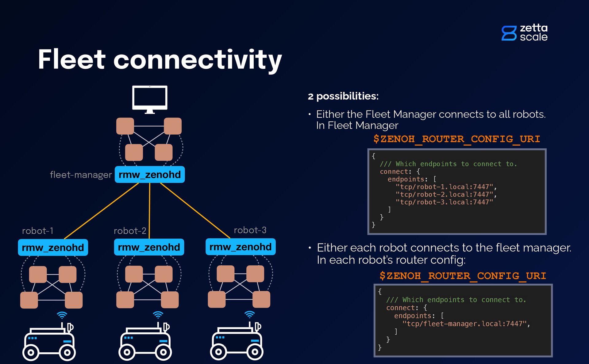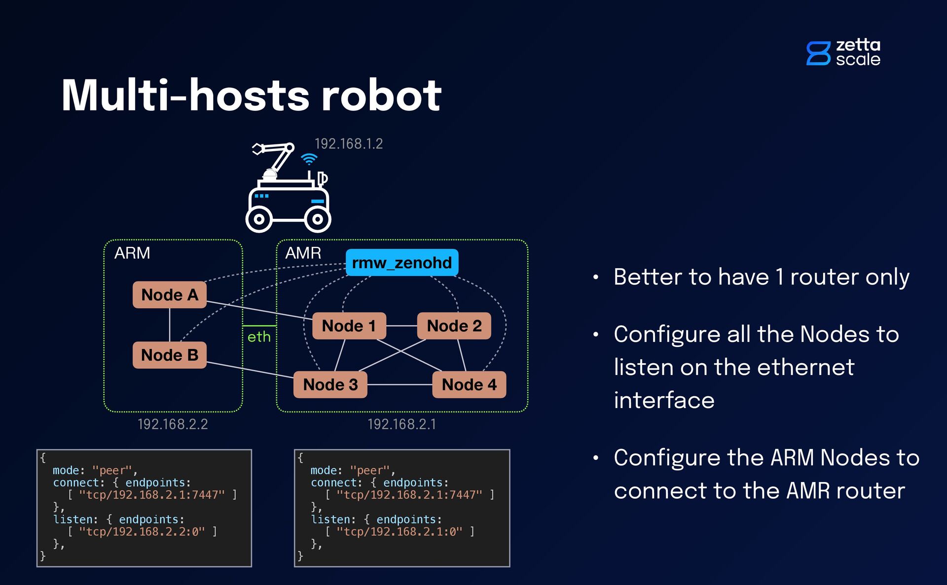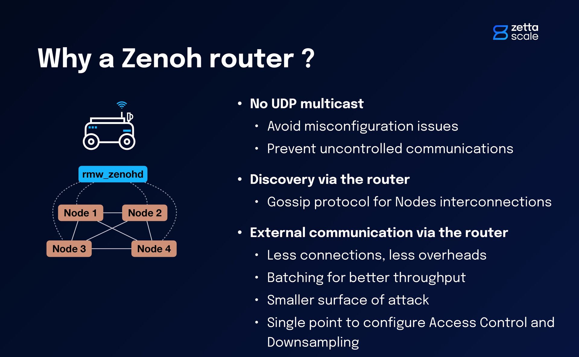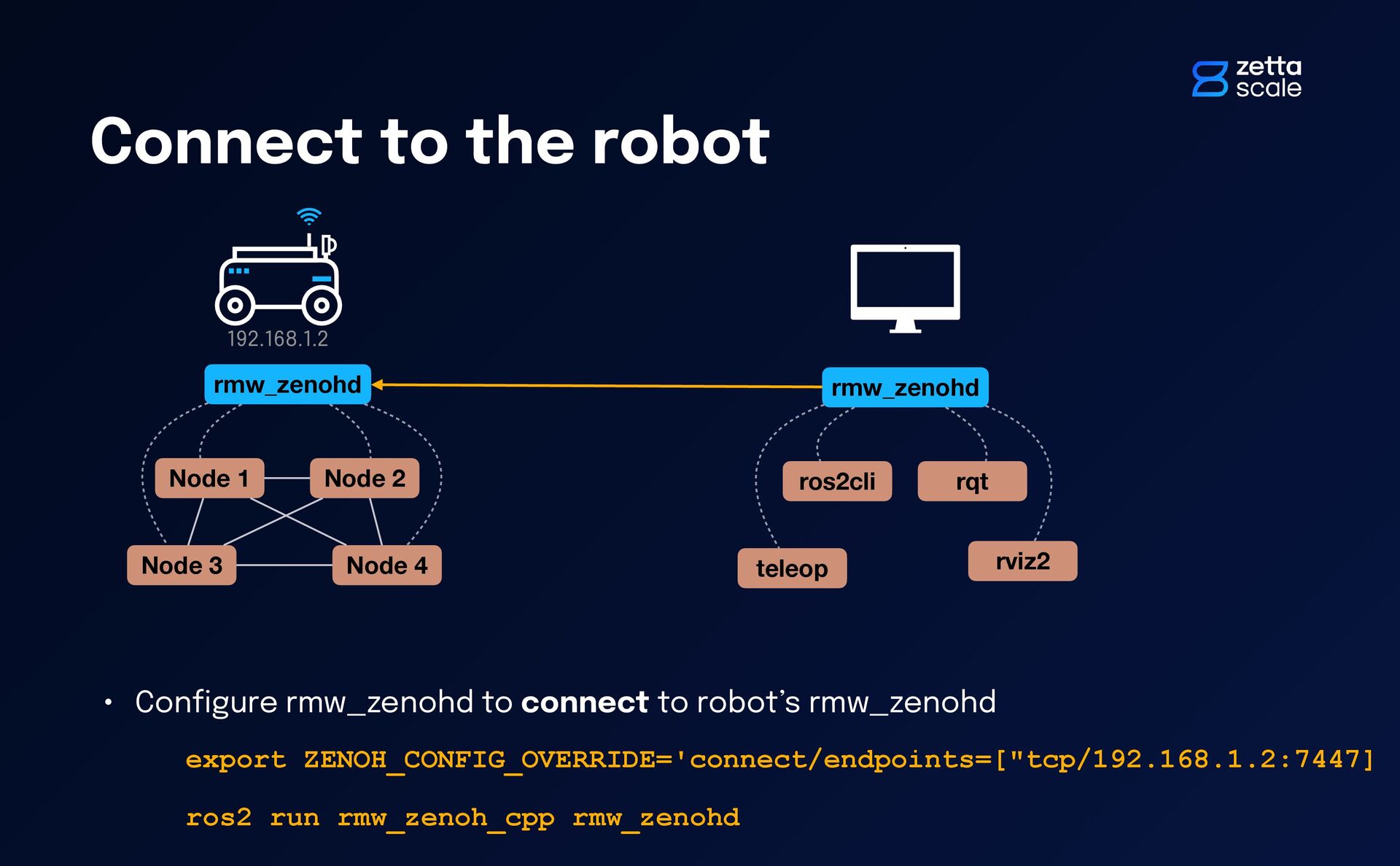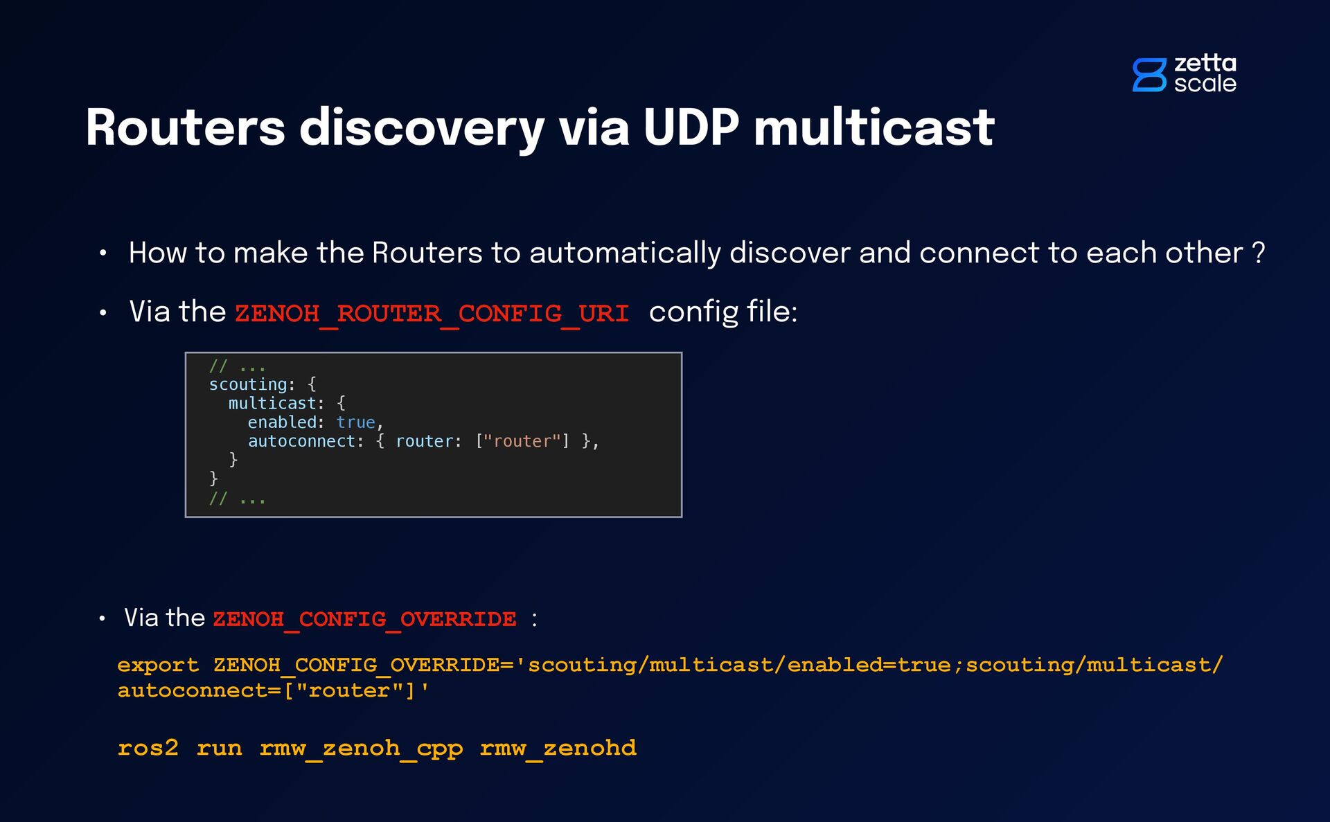 Node 3 Node 4 rmw_zenohd • In /opt/ros/$ROS_DISTRO/share/rmw_zenoh_cpp/con fi g/ • For the Zenoh router: DEFAULT_RMW_ZENOH_ROUTER_CONFIG.json5 • For all the nodes: DEFAULT_RMW_ZENOH_SESSION_CONFIG.json5 { mode: "router", connect: { endpoints: [] }, listen: { endpoints: [ "tcp/[::]:7447" ] }, scouting: { gossip: { enabled: true, autoconnect: { router: [], peer: ["router", "peer"] } } } } { mode: "peer", connect: { endpoints: [ "tcp/localhost:7447" ] }, listen: { endpoints: [ "tcp/localhost:0" ] }, scouting: { gossip: { enabled: true, autoconnect: { router: [], peer: ["router", "peer"] } } } }