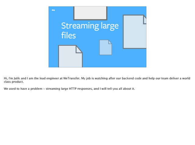 lead engineer at WeTransfer. My job is watching after our backend code and help our team deliver a world class product. We used to have a problem - streaming large HTTP responses, and I will tell you all about it.