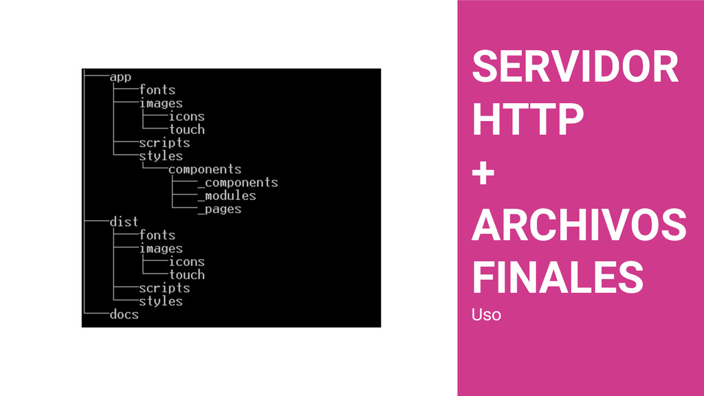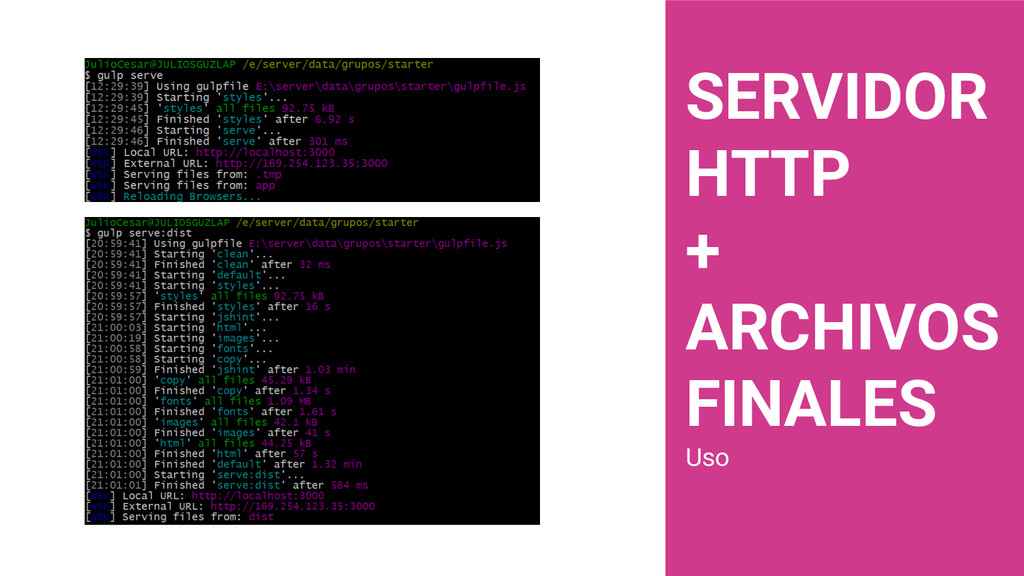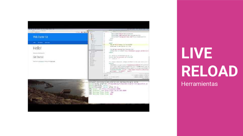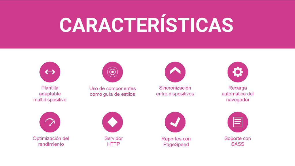 dispositivos Recarga automática del navegador Soporte con SASS Reportes con PageSpeed Servidor HTTP Optimización del rendimiento Plantilla adaptable multidispositivo