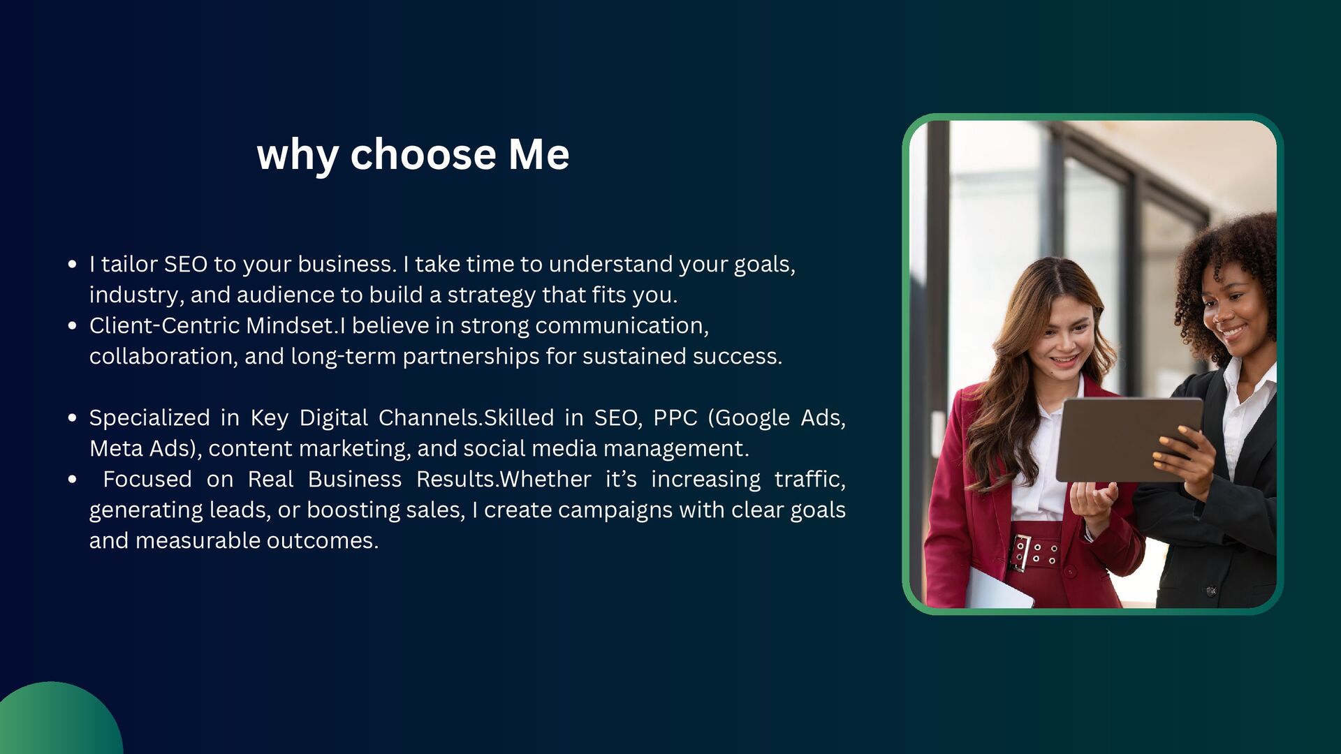 take time to understand your goals, industry, and audience to build a strategy that fits you. Client-Centric Mindset.I believe in strong communication, collaboration, and long-term partnerships for sustained success. Specialized in Key Digital Channels.Skilled in SEO, PPC (Google Ads, Meta Ads), content marketing, and social media management. Focused on Real Business Results.Whether it’s increasing traffic, generating leads, or boosting sales, I create campaigns with clear goals and measurable outcomes.