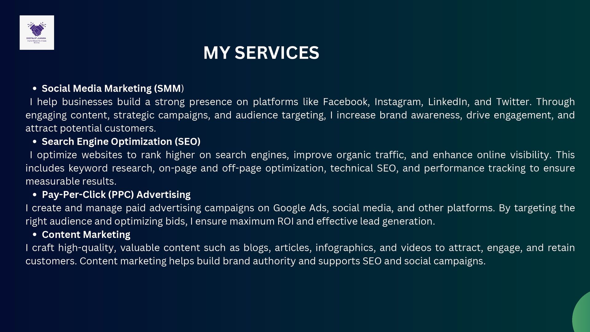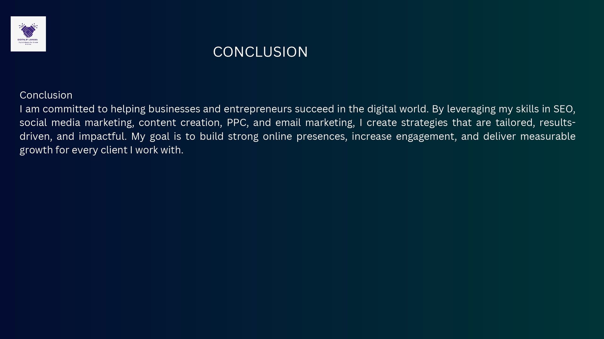 succeed in the digital world. By leveraging my skills in SEO, social media marketing, content creation, PPC, and email marketing, I create strategies that are tailored, results- driven, and impactful. My goal is to build strong online presences, increase engagement, and deliver measurable growth for every client I work with.